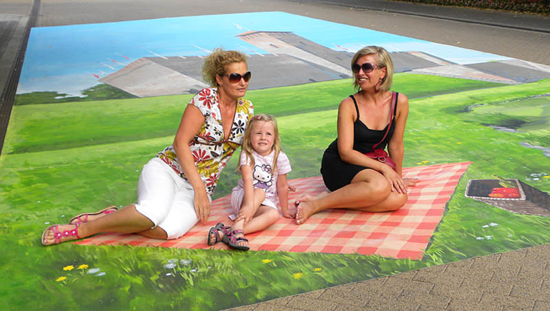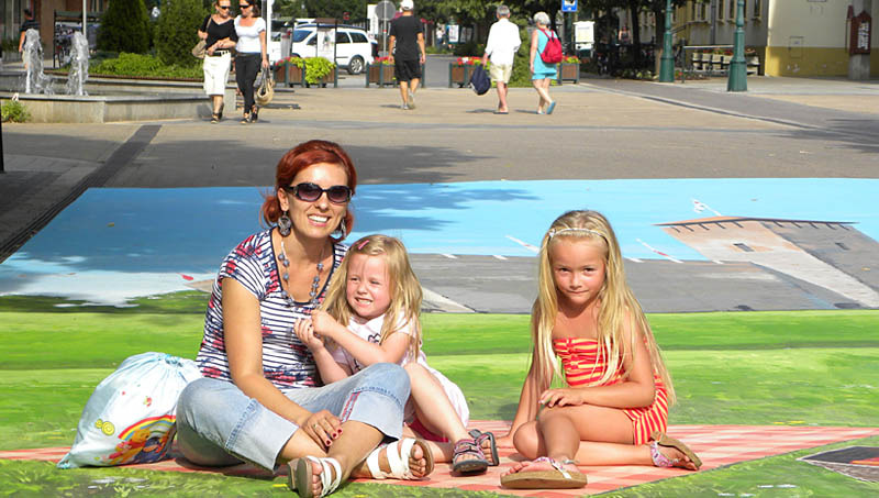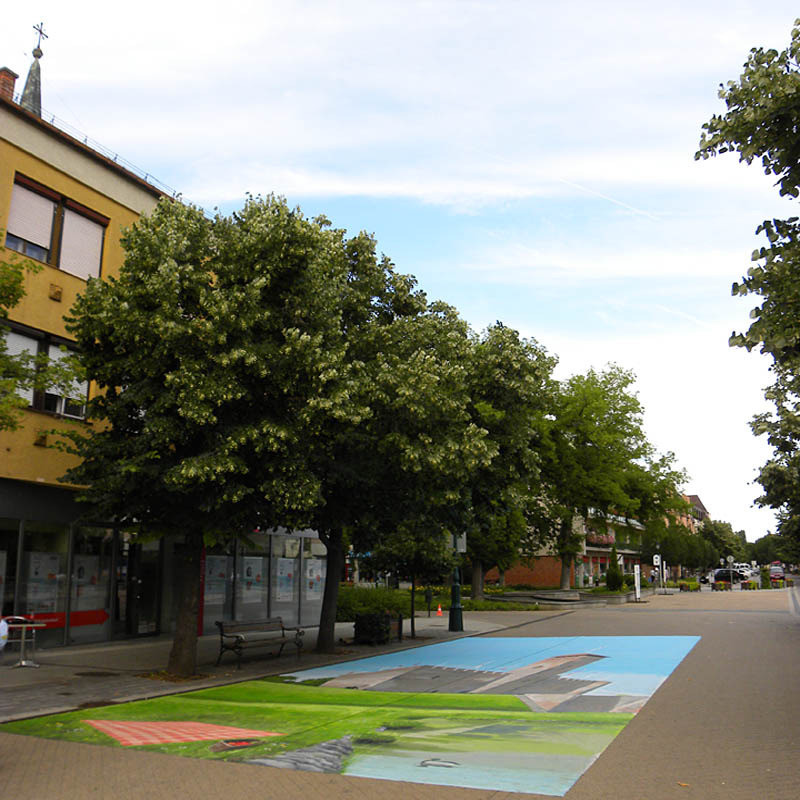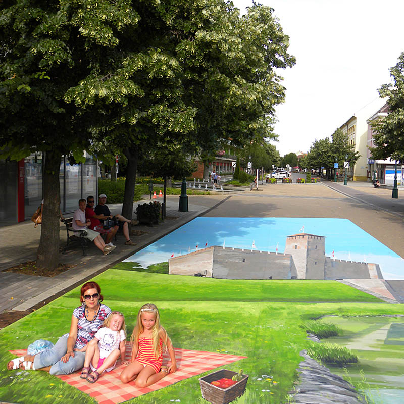 Szabados Annamária irodavezető a Gyulai Hírlap Online kérdésére elmondta, a mostanában divatossá váló háromdimenziós aszfaltrajzok mintájára – marketingcéllal – egy linóleumra festett, hordozható, háromdimenziós hatást keltő képet készíttettek el. A megmozdulás célja a meghökkentés volt, és az utcai jelenet abban a Gyula nevezetességeit bemutató imázsfilmben is szerepelni fog, amit nyolc napon keresztül, július 11-től 20-ig forgatnak a város több mint 50 helyszínén. A film célcsoportjai a családosok, az idősebb korosztály, valamint a középkorúak, főszereplői pedig Beszterczey Attila és Tébi Márta gyulai származású színészek.