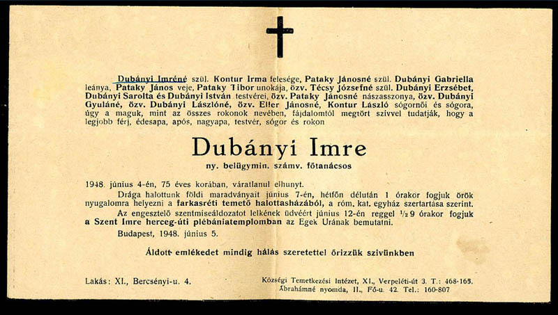 A nyugalmazott belügyminisztériumi tisztviselőként visszavonultan élő Dubányi 1948-ban távozott az árnyékvilágból, mintha csak nem akarta volna megérni azt a világot, amelytől 32 évvel korábban „elhatárolódott”. A gyászjelentés tanúsága szerint 75 éves korában váratlanul jött el érte a halál. Lehet, hogy a könnyű halál a Gyulai életben írottak jutalma volt.
