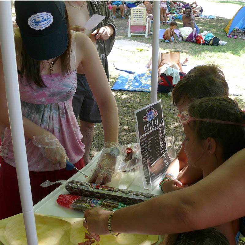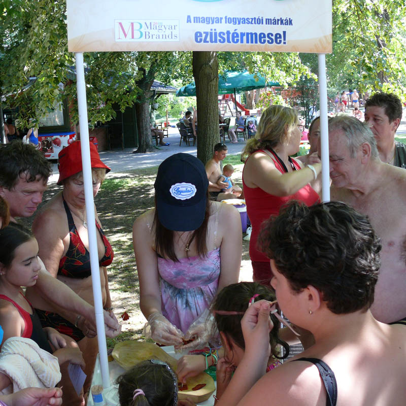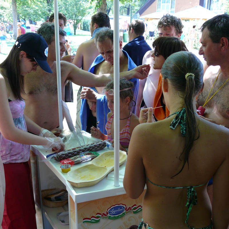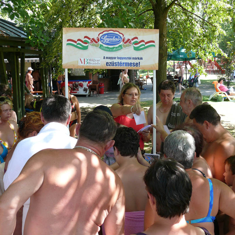 A Gyulai Turisztikai Nonprofit Kft. és a Gyulai Húskombinát kolbász kóstoltatót tartott a Gyulai Várfürdő vendégeinek. Rendkívüli sikert aratott a kezdeményezés, nem túlzás állítani, hogy valósággal megrohanták a standot az éhes és kíváncsi fürdőzők. A finom falatok mellé egy kupon is járt, melyet a fürdő egykori nyári főbejáratának jegypénztárába költöző, Turista infópont és ajándékshopban válthattak be a gyulai gasztrotermékek iránt érdeklődők. Amennyiben az ínyencek legalább 300 forint értékben vásároltak a húskombinát hentesáru különlegességeiből, egy Gyulai májaskrémet kaptak ajándékba.