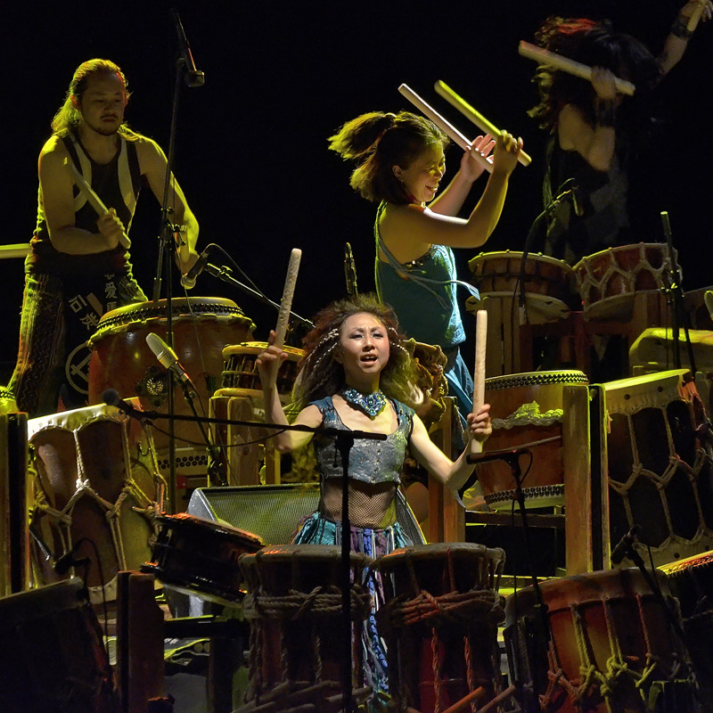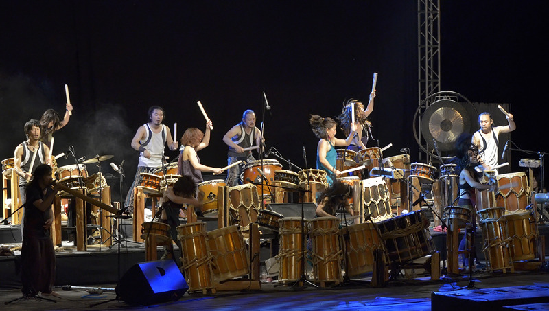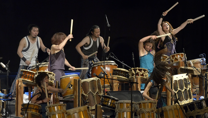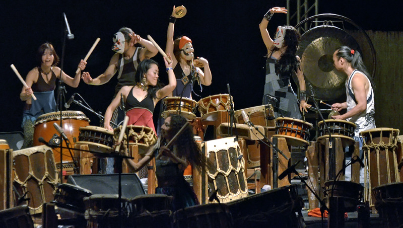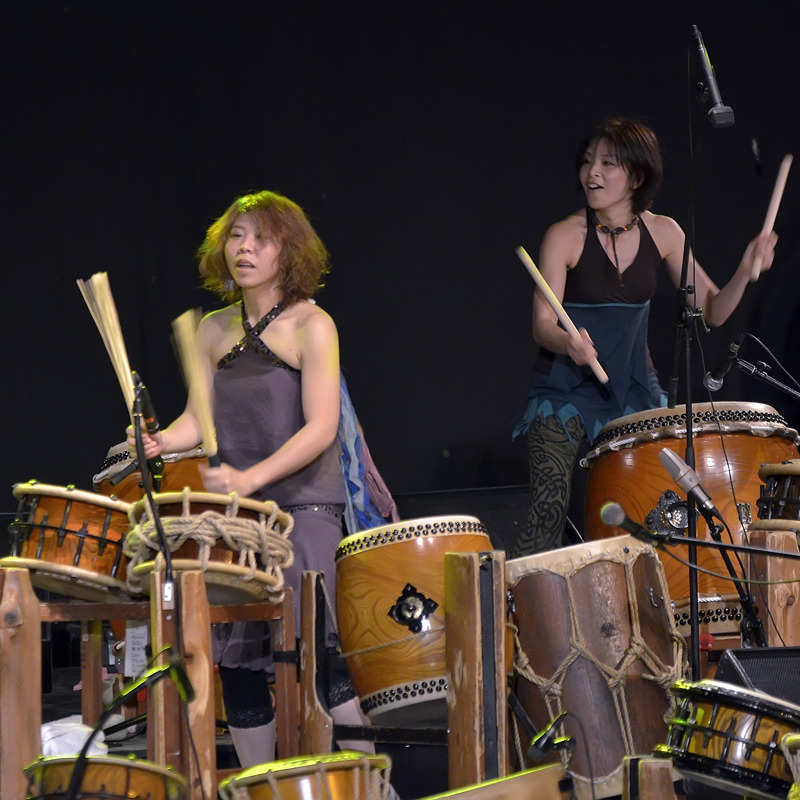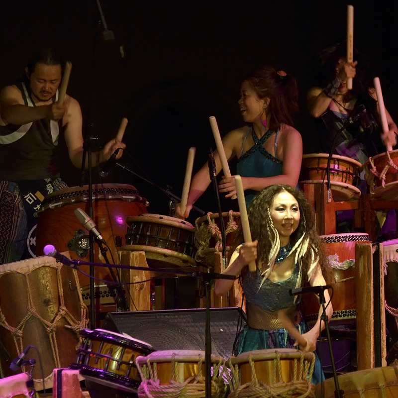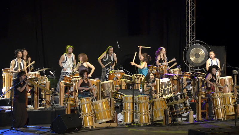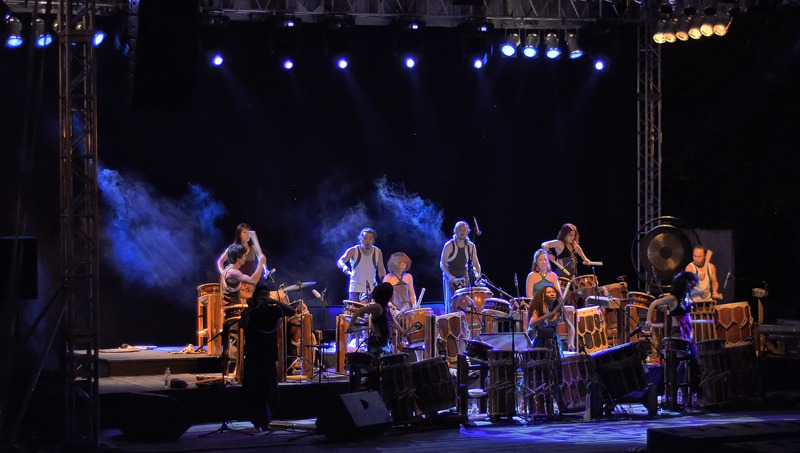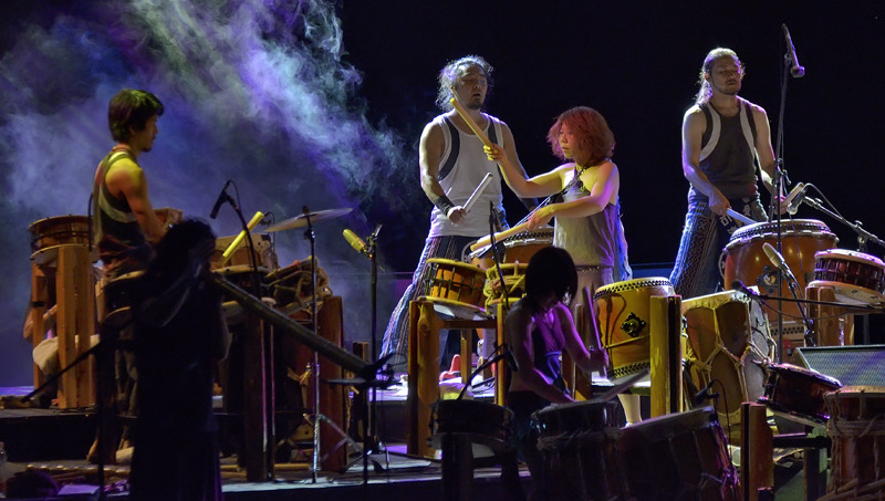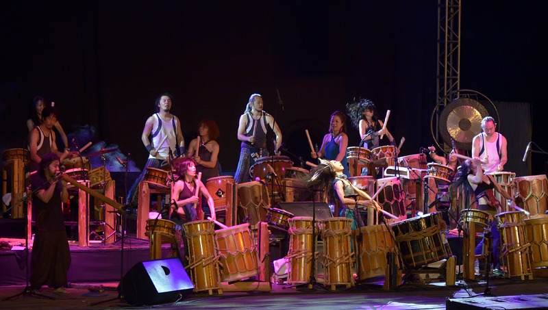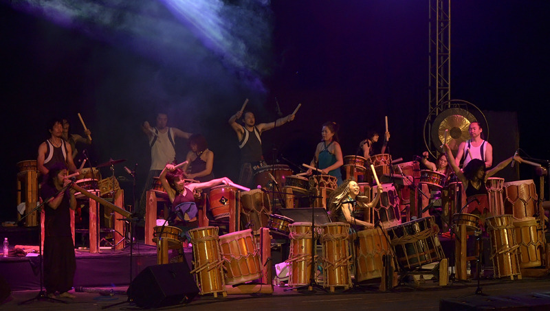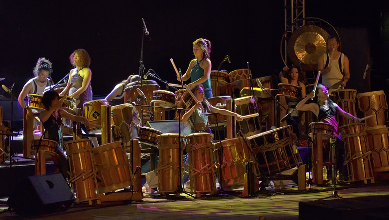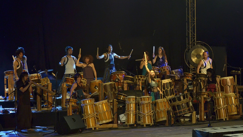 Bizonyára szinte az egész város hallhatta, ahogy szóltak a dobok, amikor nyolc nő és öt férfi ezt a rengeteget megszólaltatta. Nincs mit tenni, a dobok nem lehetnek halkak. Az együttes tagjai két jellegzetesen vastag, keményfa ütővel, az ún. bachival verték a ritmust és indították be az ember ösztön-énjét, testét és lelkét. A japándobokon kívül megszólalt még számtalan hangszer: kalimba, esőcsináló, triangulum, cinek, gongok, kolompok, harangok és más további idiofonok, ezen kívül az egyik zenész egzotikus hangszerekkel is színesítette muzsikájukat. Felcsendült kezében többek között a nálunk is ismeretes doromb, didgeridou, bambuszfuvola, vagy az elképesztő hangzású, keleti dorombféle, a dan moi. Kár, hogy a koncert első fél órájában ezek túl halkan, vagy egyáltalán nem hallatszódtak.