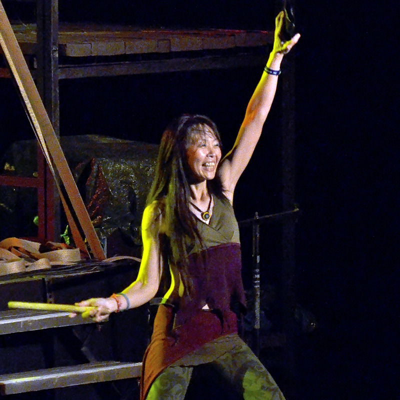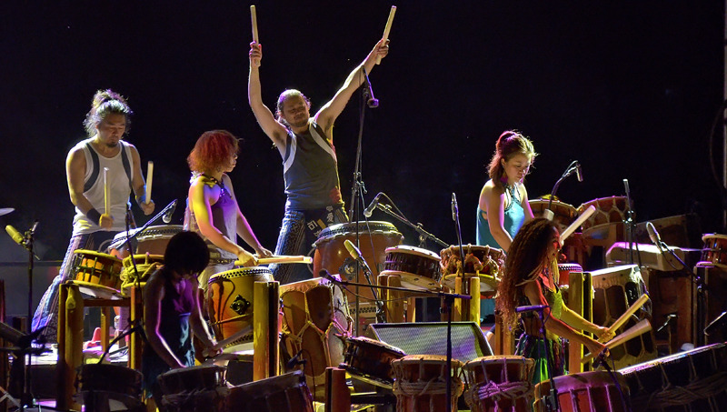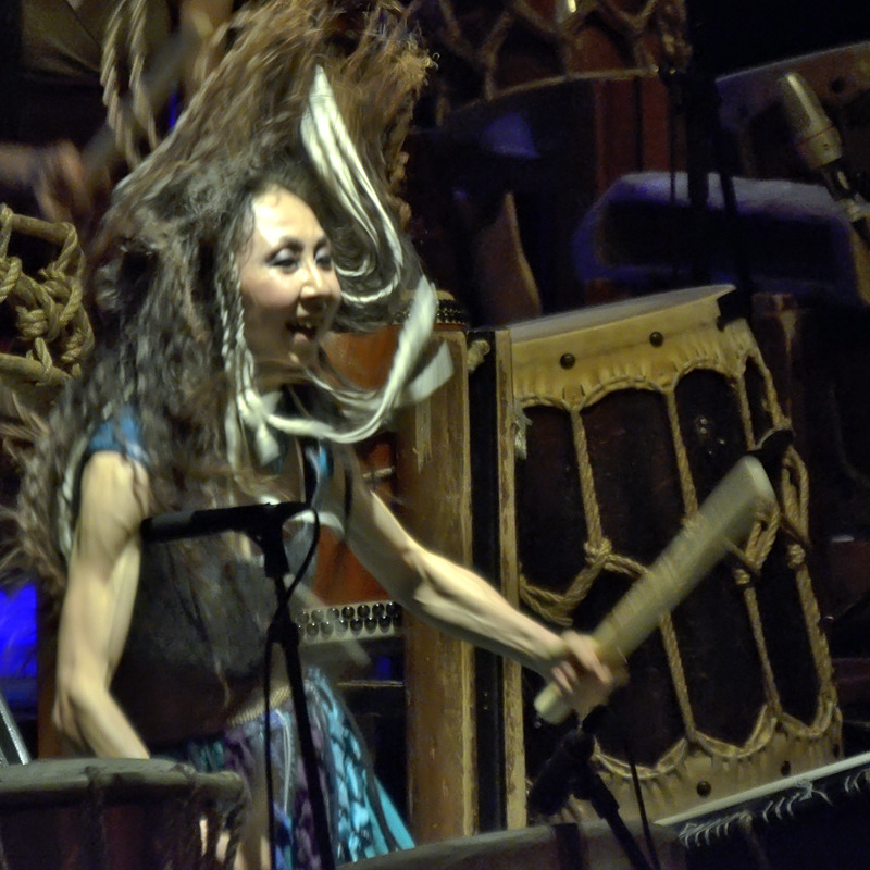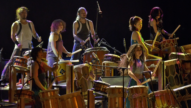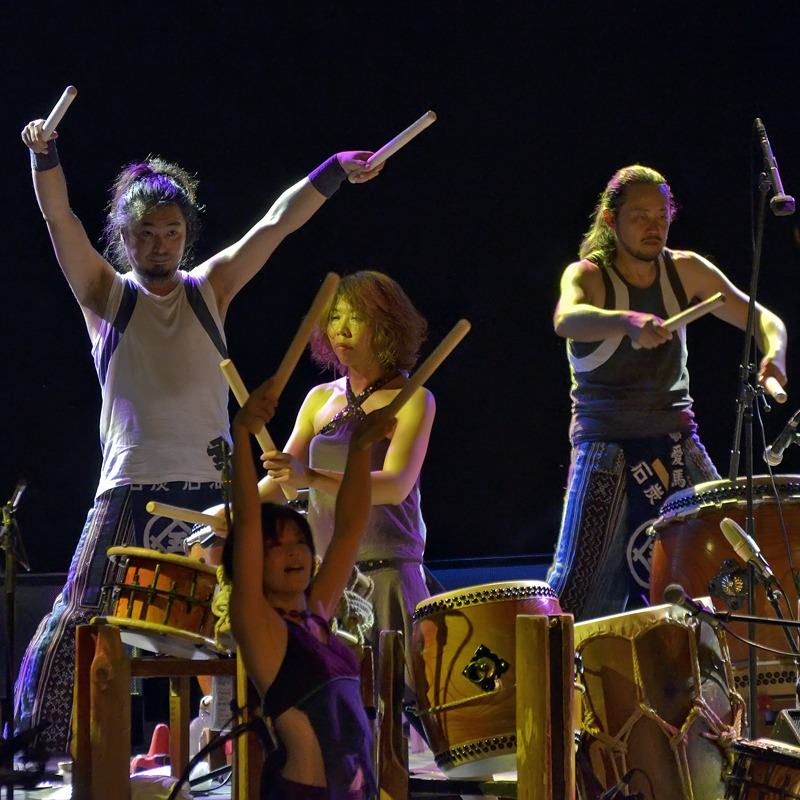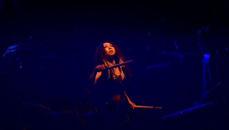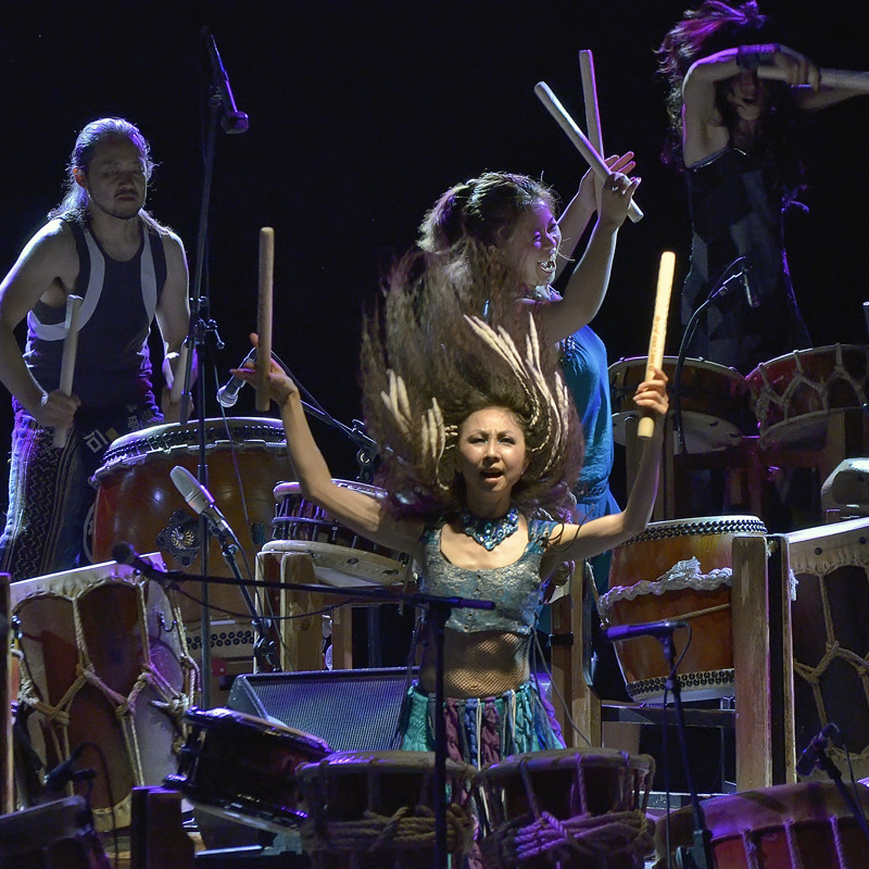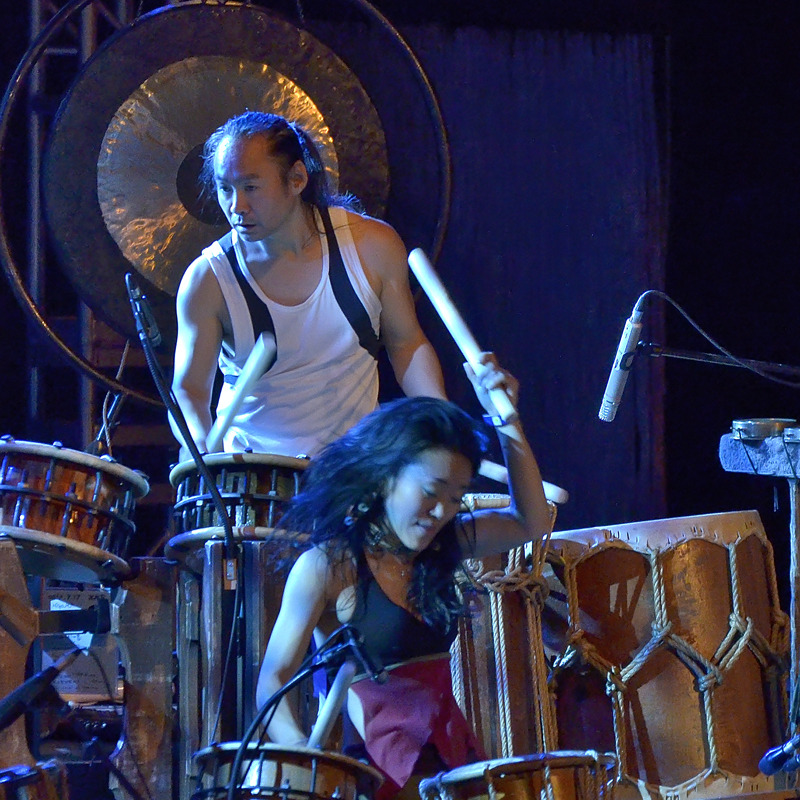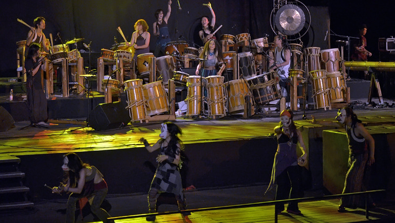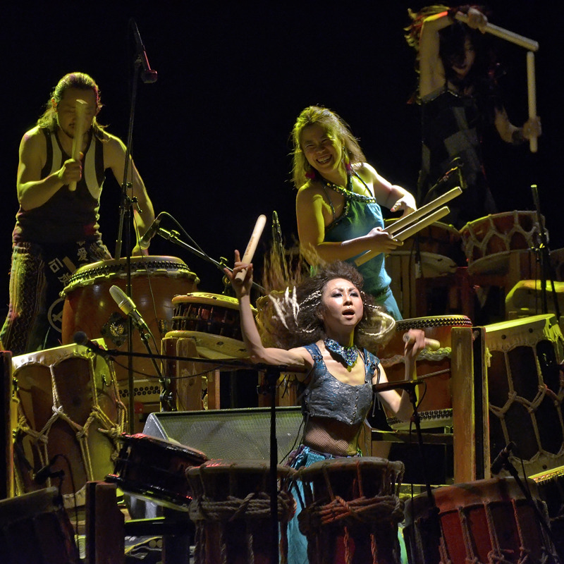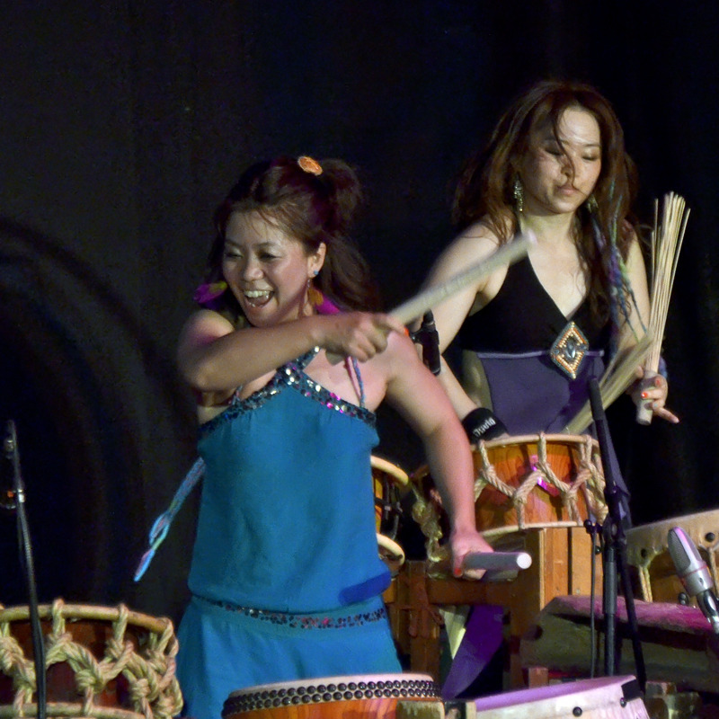 Bizonyára szinte az egész város hallhatta, ahogy szóltak a dobok, amikor nyolc nő és öt férfi ezt a rengeteget megszólaltatta. Nincs mit tenni, a dobok nem lehetnek halkak. Az együttes tagjai két jellegzetesen vastag, keményfa ütővel, az ún. bachival verték a ritmust és indították be az ember ösztön-énjét, testét és lelkét. A japándobokon kívül megszólalt még számtalan hangszer: kalimba, esőcsináló, triangulum, cinek, gongok, kolompok, harangok és más további idiofonok, ezen kívül az egyik zenész egzotikus hangszerekkel is színesítette muzsikájukat. Felcsendült kezében többek között a nálunk is ismeretes doromb, didgeridou, bambuszfuvola, vagy az elképesztő hangzású, keleti dorombféle, a dan moi. Kár, hogy a koncert első fél órájában ezek túl halkan, vagy egyáltalán nem hallatszódtak.