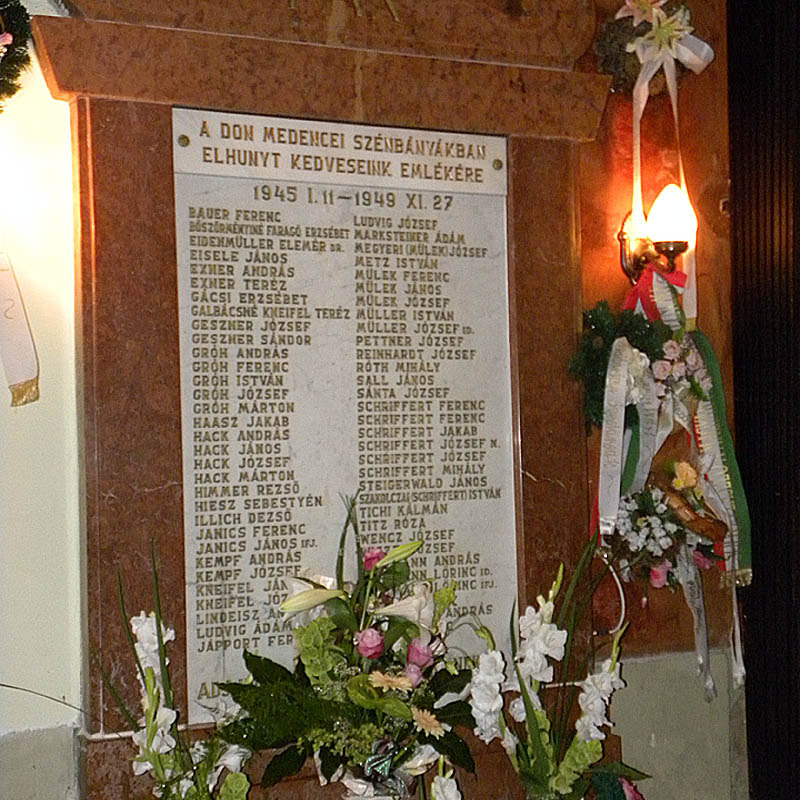 A szentmisét Tóth Kata szavalata és Kempf Márta éneke zárta, majd a megemlékezők virágokat helyeztek el a templomban található emléktáblánál, melyen azoknak a neve olvasható, akik a Donyec-medencei szénbányákban lelték halálukat. A hálaadó misét követően az Apor téri haranglábnál folytatódott a megemlékezés, ahol Kovács Lajosné Murvai Zsuzsanna, a K. Schriffert Hagyományőrző Kör elnöke köszöntötte a megjelenteket. A Schriffert Mihály, Kern József és Japport József által készített haranglábat 1999-ben avatták fel, és szentelték be. Azóta, ha egy túlélő eltávozik az élők sorából, meghúzzák e harangot.