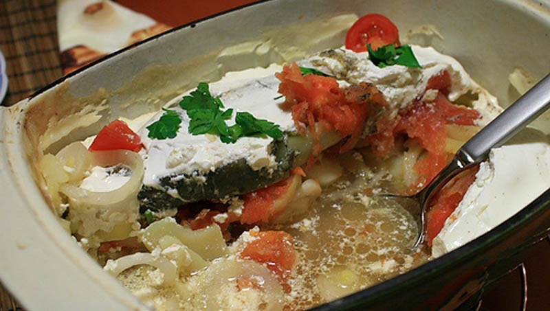 A karikára vágott burgonyát frituban elősütjük (így kevés zsiradékot használunk és energiaszegényebb lesz az ételünk), majd a tepsibe terítve, ráfektetjük a sóval, pirospaprikával ízesített halszeleteket. Betakarjuk a karikára szeletelt vöröshagymával, lecsóval, csíkokra vágott szalonnával. Tejföllel meglocsolva megsütjük.