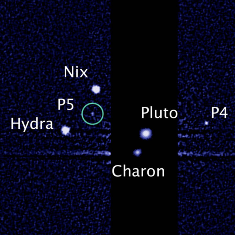 2011-ben újabb holdjára lettek figyelmesek a Hubble Űrteleszkóp felvételein, melyet P4 néven kereszteltek el. Az új holdacskát először a 2011. június 28-án rögzített felvételen azonosították, majd a július 3-án és július 18-án készített képek pedig megerősítették létezését. Most pedig egy évre rá egy újabb holdat kapott lencsevégre a Hubble a lefokozott Pluto körül. Az egyelőre P5 névre hallgató égitest mindössze 10 és 25 kilométer közötti átmérőjű, ami az eddig a legkisebb észlelt hold a Naprendszerben. A törpebolygó holdjai közül a Chanon messze a legnagyobb, 1043 kilométer átmérőjű. A Nix és a Hydra 32 és 113 kilométer közöttiek, míg a P4 valószínűleg 13 és 34 kilométer közötti átmérőjű, úgy mint a most felfedezett. Az elképzelések szerint a teljes holdrendszer a törpebolygó és egy szintén bolygóméretű test ütközése következtében jött létre a Naprendszer korai időszakában. A törmelékek először Pluto körüli pályára álltak, majd ebből a törmelékből alakultak ki a holdak. Elképzelhető, hogy a Pluto holdjainak mikrometeoritokkal történő ütközései gyűrűket is létrehozhattak a törpebolygó körül, de ennek egyelőre nincs nyoma még.