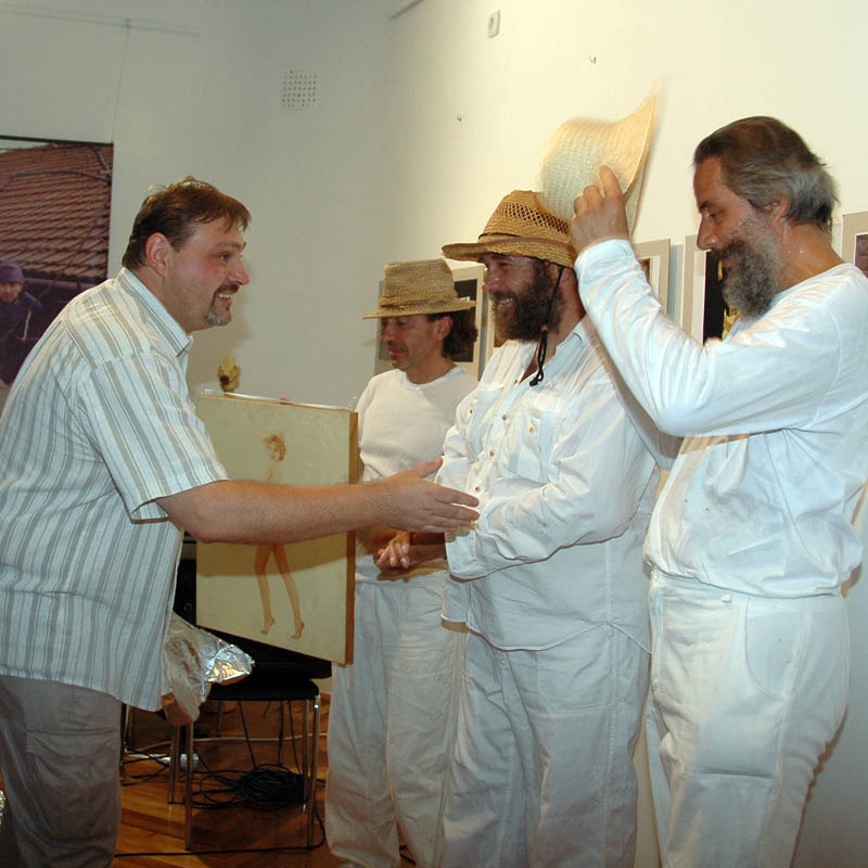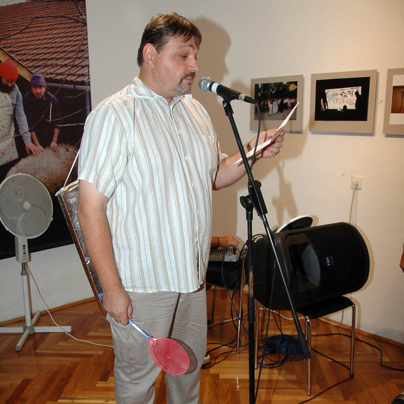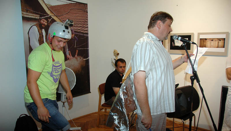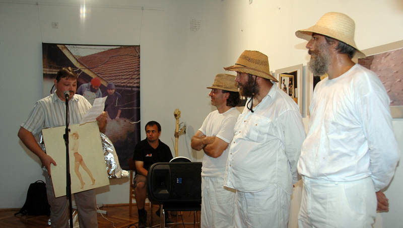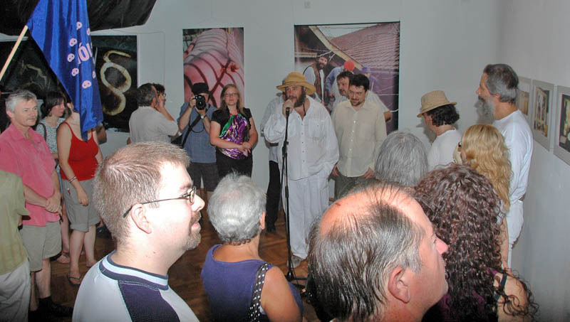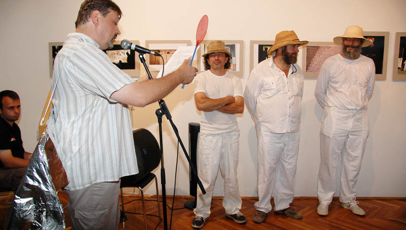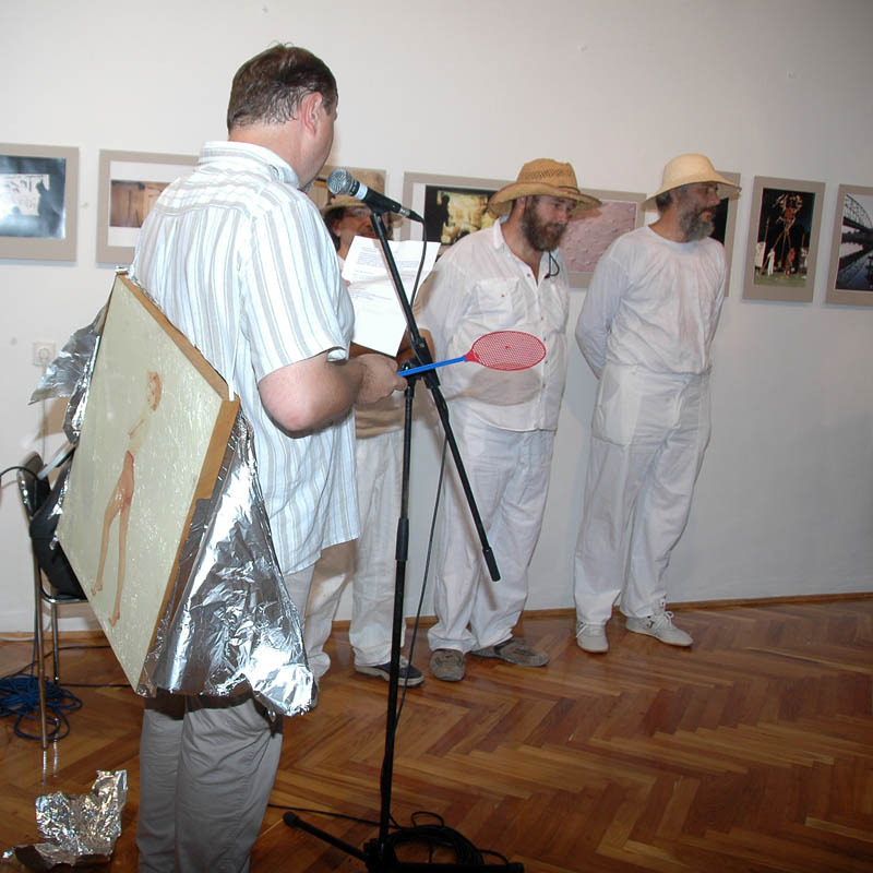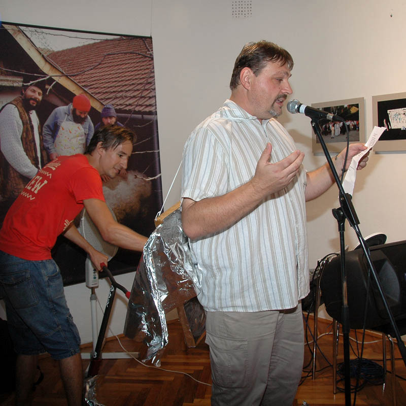 Ezután a Dürer Teremben folytatódott a műsor, ahol Erdődi Ferenc Vilmos nyitotta meg a kiállítást. Természetesen tőle sem számíthattunk unalmas protokollra. Gyűrött papírról olvasta háziorvosának és újságkihordó barátjának segítségével megírt ünnepi beszédét, amelyben feltételes és tagadó módban azt taglalta, hogyan nem szabadna megnyitnia a kiállítást.