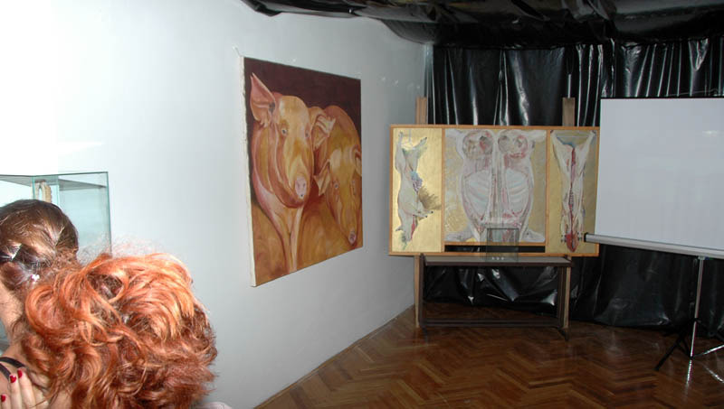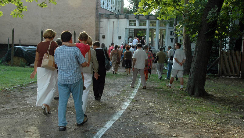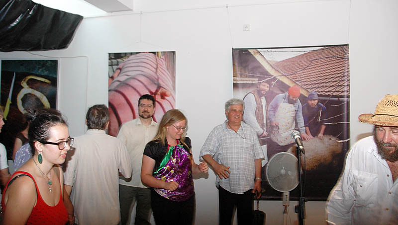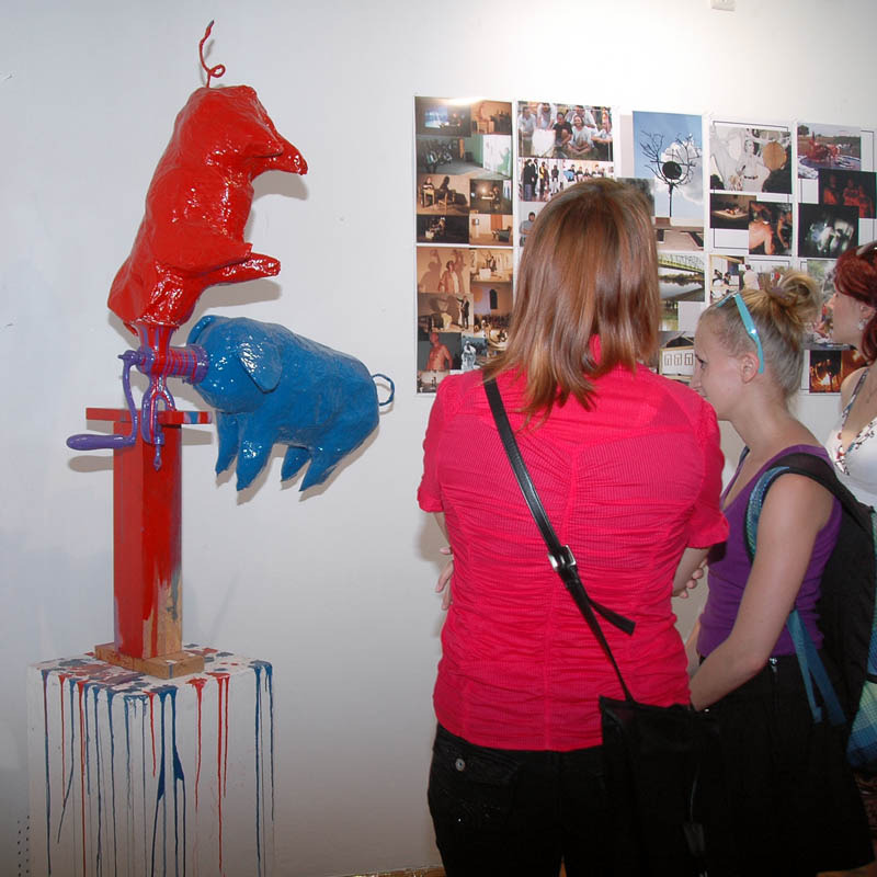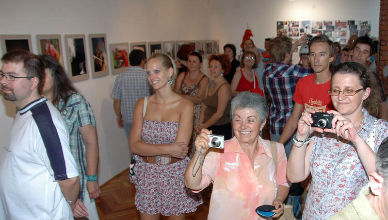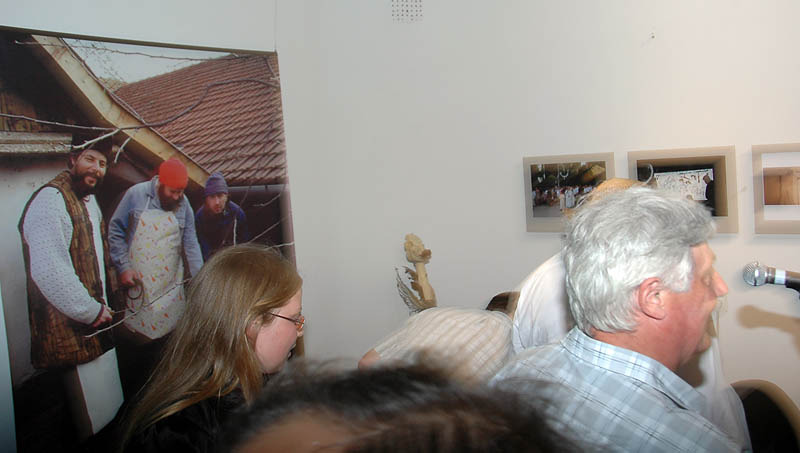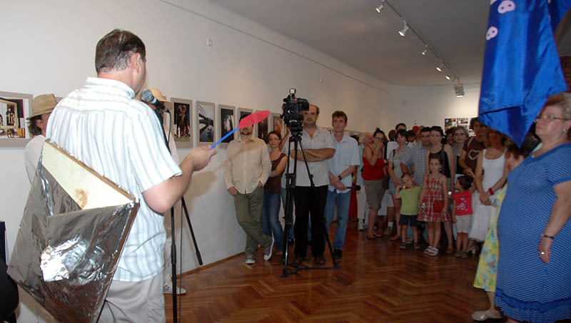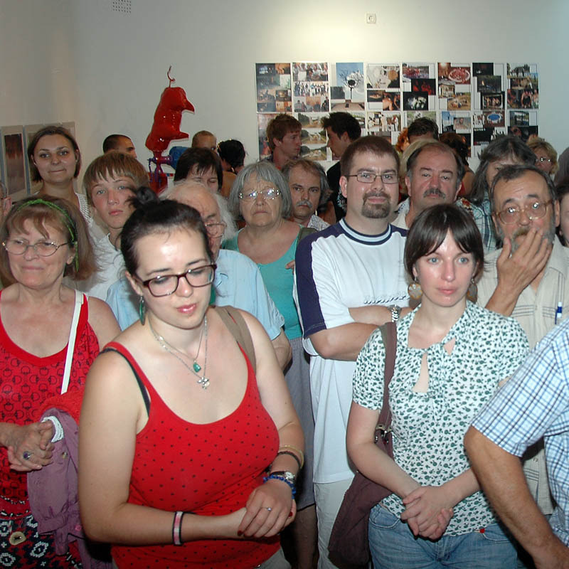 Ezután a Dürer Teremben folytatódott a műsor, ahol Erdődi Ferenc Vilmos nyitotta meg a kiállítást. Természetesen tőle sem számíthattunk unalmas protokollra. Gyűrött papírról olvasta háziorvosának és újságkihordó barátjának segítségével megírt ünnepi beszédét, amelyben feltételes és tagadó módban azt taglalta, hogyan nem szabadna megnyitnia a kiállítást.
