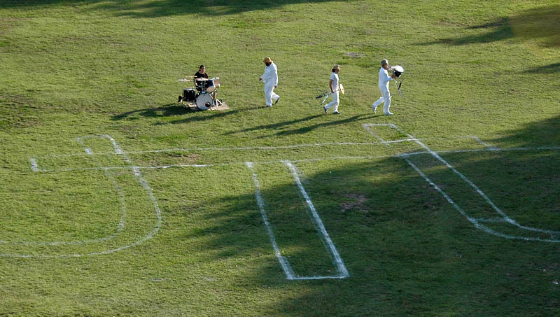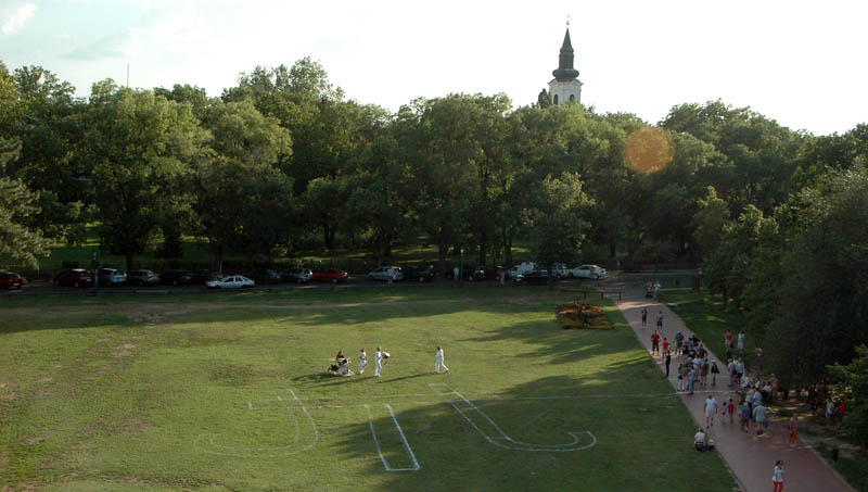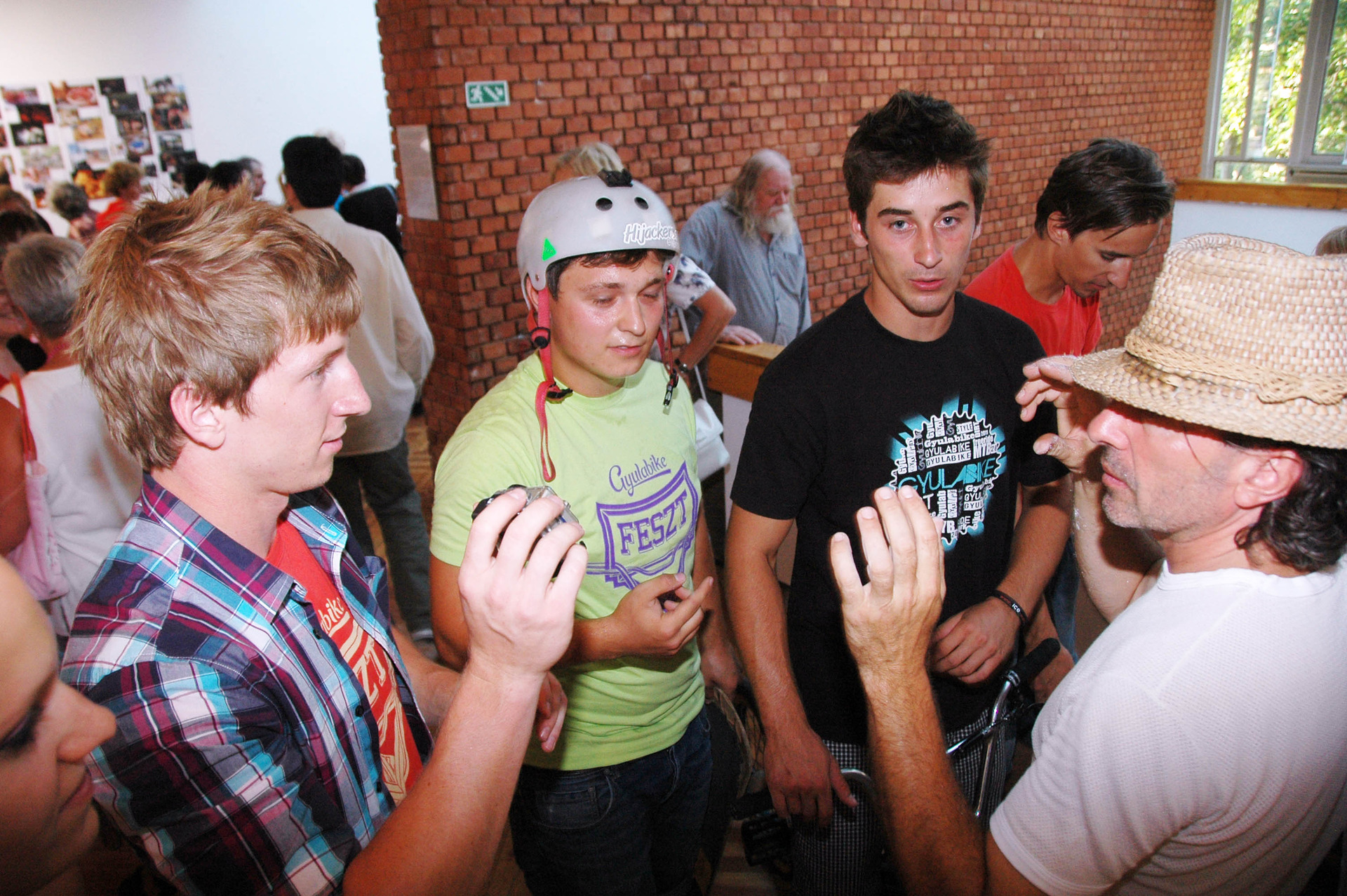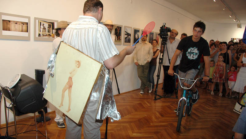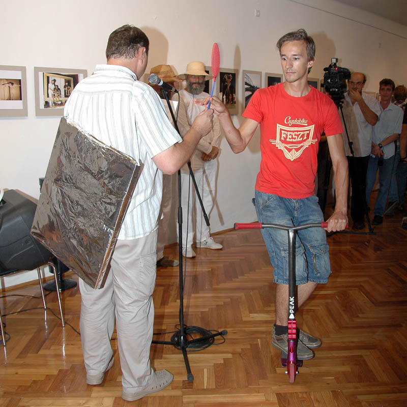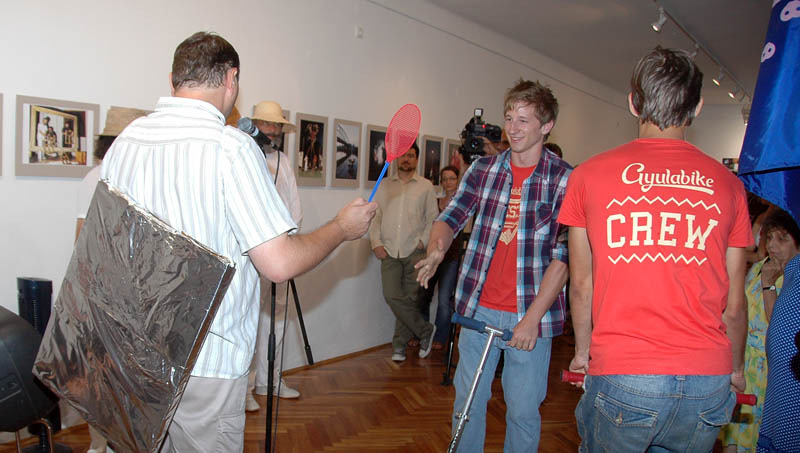 Mindeközben a Gyulabike-os srácok kerékpáron, rolleron és gördeszkán rendre megtámadták, hogy egy légycsapóval kibontsák a hátára aggatott és alufóliába csomagolt képet, amelyet végül az ünnepelt triónak adományozott.