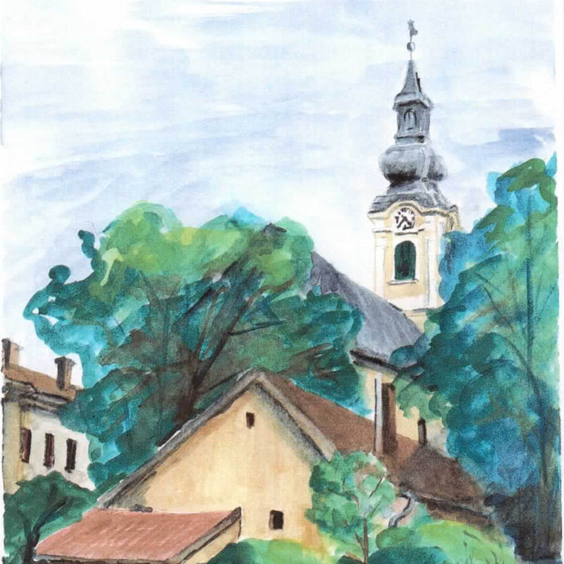 Kukár István akvarellje a gyulai református templomról - részlet