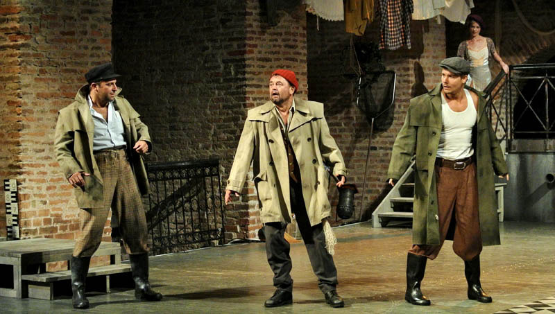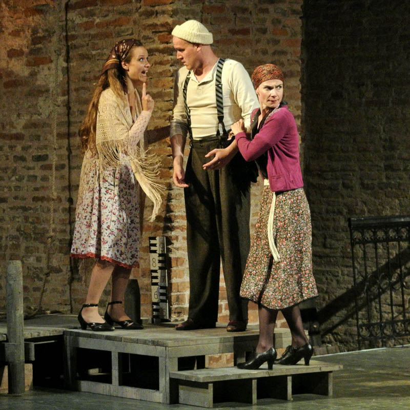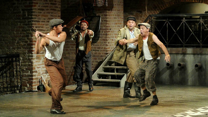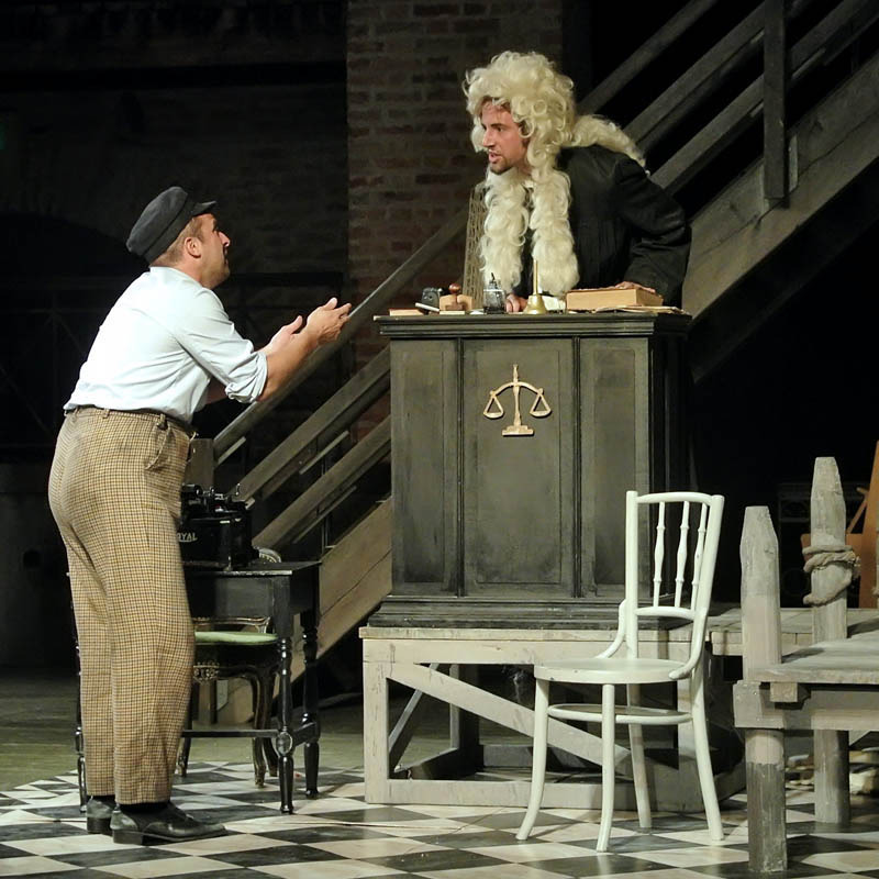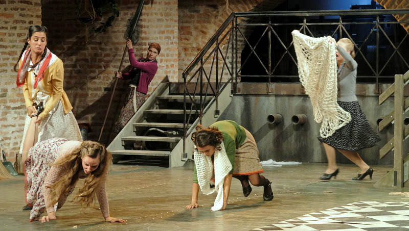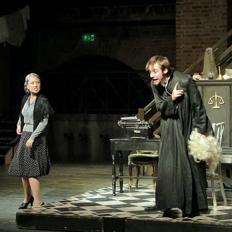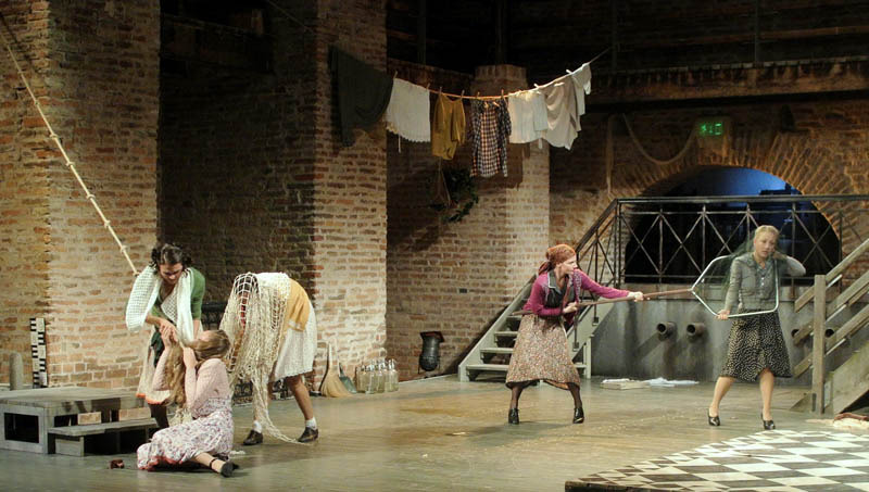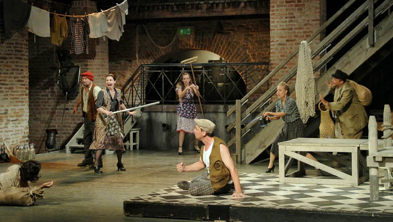 Rusznyák Gábor mintha hezitált volna, hogy a történet újraértelmezése mellett döntsön-e, hiszen az 1700-as években megírt vígjátékot 20. századi környezetbe ültette át. Ennek azonban – a karakterekben rejlő komikumra koncentráló darabban – nem volt jelentősége, csupán a modern fordításnak teremtette meg a hátterét. Az olasz népszínműveket megidézve a komédia szereplői előadás közben közvetlen kapcsolatot tartottak fent a nézőkkel. A darabot gyakran kísérték színészi kiszólások, amelyek közel engedték a közönséghez az előadást, a Pokróc Libera (Hajdú Melinda) és a velencei jegyző, Isidoro (Porogi Ádám) közti párbeszédben a gyulai várra tett utalás azonban már kissé erőltetettre sikerült. A színészek remekül használták ki a várszínpadban rejlő lehetőségeket, szinte az egész várat bevonták a játéktérbe. Jó ötlet volt a rendező részéről, hogy az egyes helyszínek közti váltást zenészek segítségével hidalta át, hiszen így megakadályozta, hogy a néző – a színpadon zajló pakolászás láttán – túlságosan kizökkenjen a darabból.