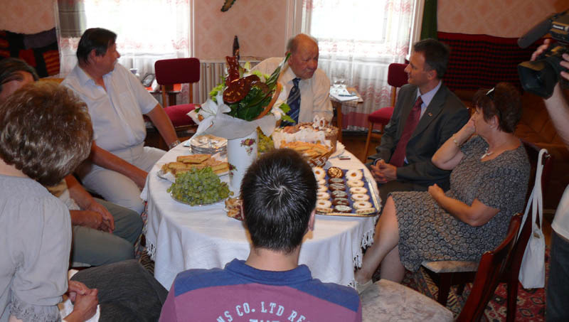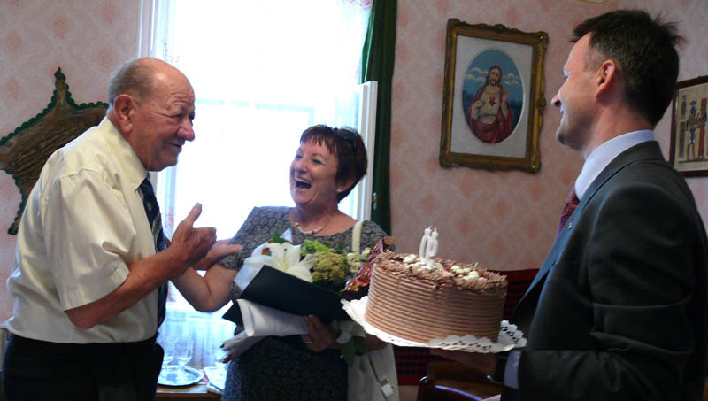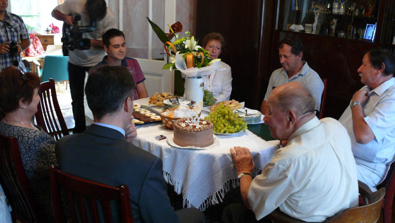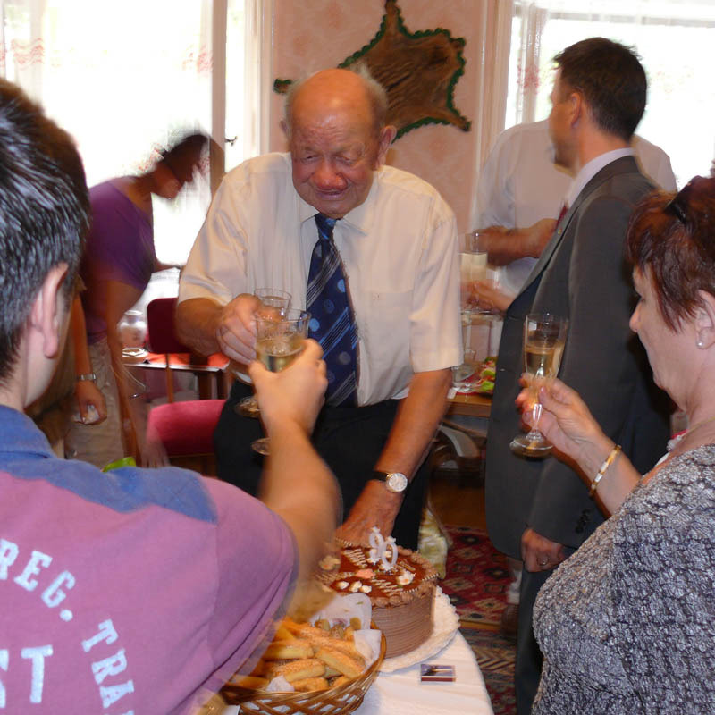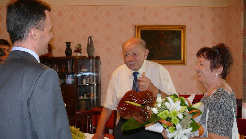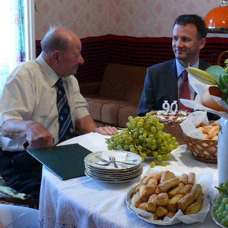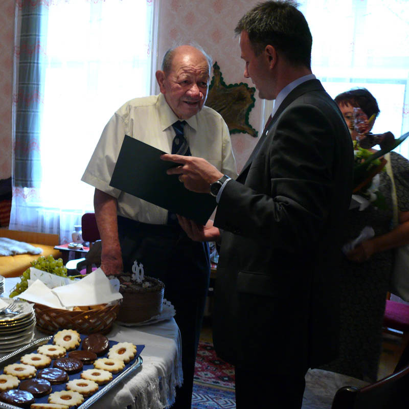 Baudermann Dezső Elek bácsit kilencvenedik születésnapja alkalmából köszöntötte ma délután dr. Görgényi Ernő polgármester és Becsyné dr. Szabó Márta címzetes főjegyző. Dezső bácsi 1922. szeptember 14-én – kádár család gyermekeként – született Gyulán. Lakhelye születésétől a Toronyi u. 8. szám. Három testvére volt, már csak ő él egyedül. Hívő katolikus család volt az övéké, hittanra Apor Vilmos tanította. Iskoláit Gyulán végezte, a 4 polgári után inasévek következtek, majd – kádárként – közös vállalkozásban dolgozott édesapjával.