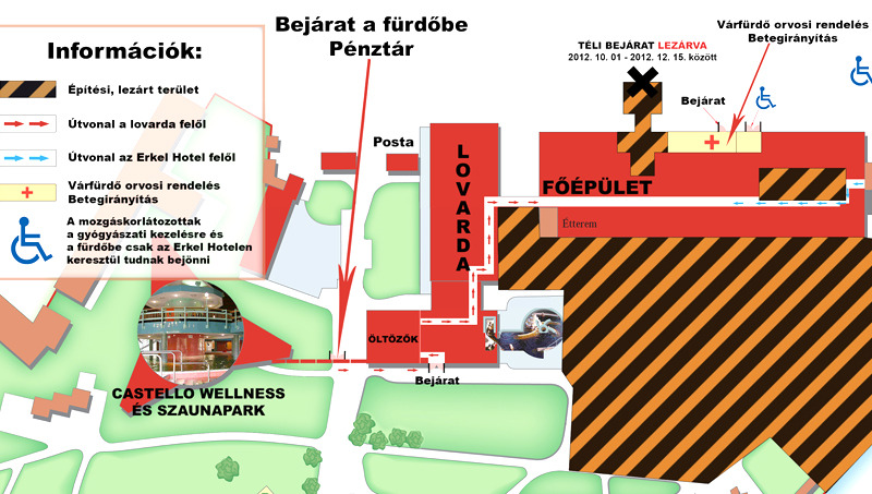 A Gyulai Várfürdő Fejlesztése 2009 című projekt munkafolyamatában hamarosan következő szintre lép. Október 1-jétől december közepéig a fürdő főbejárata átkerül a nyári főbejárathoz, a főépület a Lovardán keresztül továbbra is elérhető. Megújul a főépületben a téli főbejárat, az öltözőkbe új öltözőszekrényeket telepítenek, megújul az Erkel Hotel felőli fehér terem. Az Erkel Hotel vendégei a megszokott átjárón keresztül, épületen belül, egy ideiglenes útvonalon át érik el a gyógyászat és a fürdő egyéb szolgáltatásait. Az orvosi rendelés és betegirányítás kizárólag az utcáról közelíthető meg. A mozgáskorlátozottak a gyógyászati kezelésre és a fürdőbe csak az Erkel Hotelen keresztül tudnak bemenni, a gyógyászati kezelések változatlanul elérhetőek lesznek a Lovardán keresztül. A főépületből a parkot átmenetileg csak a Lovardán keresztül lehet megközelíteni. Az árnyékolós és a pezsgős medence várhatóan a kivitelezés teljes időtartama alatt szünetel. Az építkezés ideje alatt elérhető gyógyvizes medencék a polip medence, a Lovarda épületében található medencék, a dögönyözős medence azonban október 25-ig használható. A fürdő többi medencéje a téli üzemrend szerint zavartalanul működik, a teherporta nem üzemel. A tájékozódást a fürdő területén tájékoztató táblák segítik.