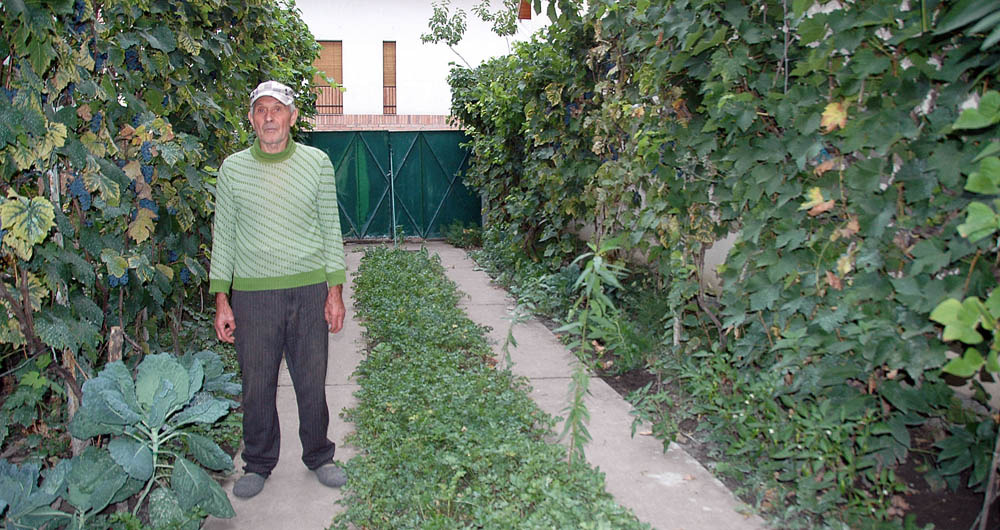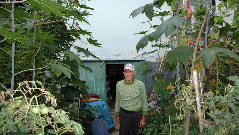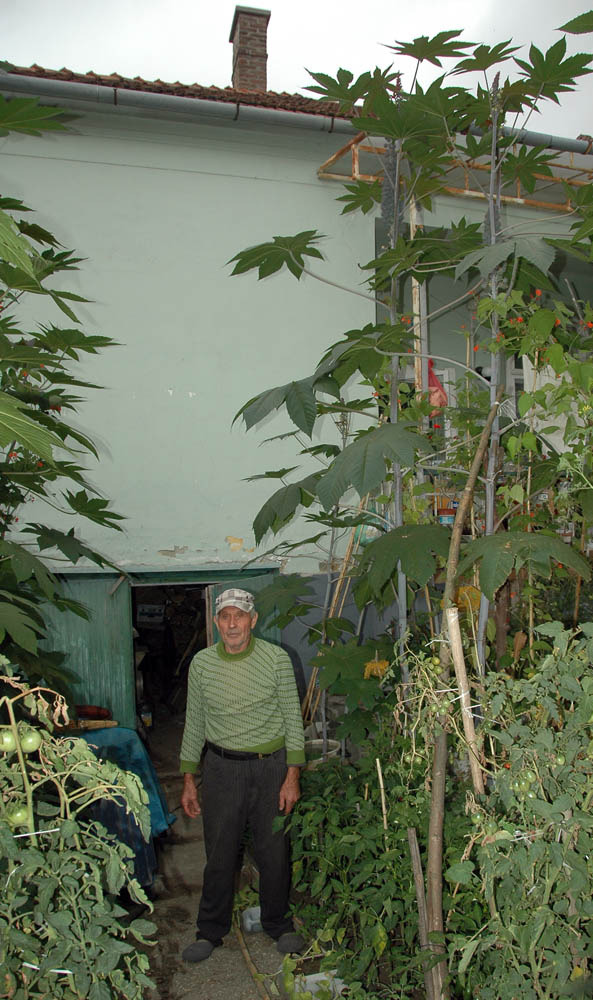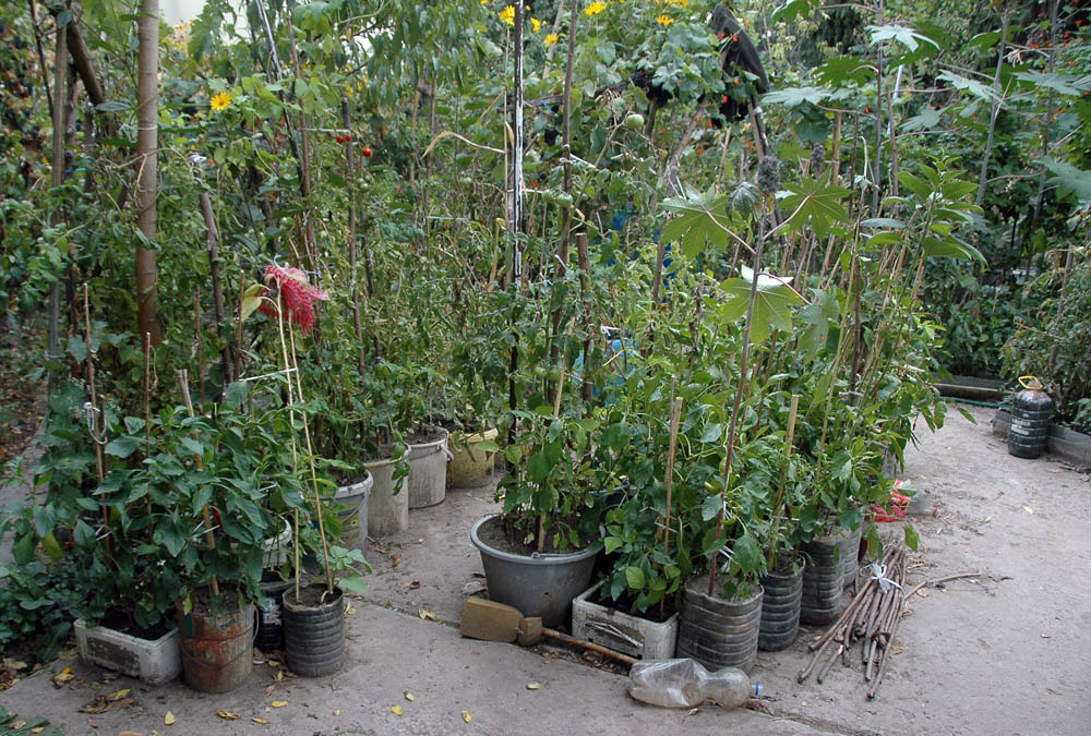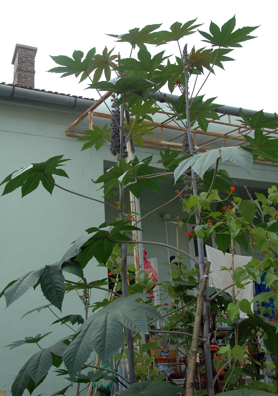 Udvara már önmagában is rendkívüli látvány, hiszen mintegy 80%-a lebetonozott és ennek ellenére a kertecske zöldell a számtalan fajta növénytől, terem ott többféle paradicsom, szőlő, szeder, napraforgó, borsó, paprika, citromfű, füge, csicsóka és még legalább ennyi féle flóra. A nyugdíjas kertész 100 darab vödörben és különféle tartóedényekben tartja a termesztéshez szükséges földet, illetve a növényeit. Az említett hatalmas csodafa és társai is körülbelül 10 centiméteres földrétegből törnek az ég felé. A szorgalmas gazdálkodó még soha nem látott ilyen magas ricinust, amelynek szokatlan méretét a kevés földréteg miatti rendszeres öntözéssel, a trágyázással és a meleg nyárral magyarázza.