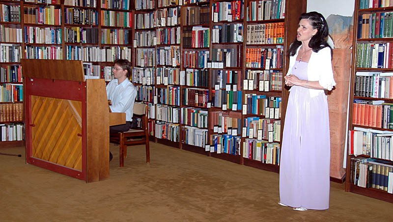 Erkel Ferenc szülővárosában a zeneszerző második operájából, a Hunyadi Lászlóból énekelte elsőként Emődi Ildikó Szilágyi Erzsébet áriáját. A Mint a tenger...kezdetű ária a könyvtári koncert címadó dala is volt. Erkel operái próbára teszik az énekeseket, nagy mélységek és nagy magasságok között vezethetik hangjukat. És sorra jöttek a remekművek: Verdi Traviátájából Violetta áriája Dumas regénye, A kaméliás hölgy nyomán, a szép etióp rabszolgalány, Aida, a Szicíliai vecsernyéből Elena hercegnő, Donozetti operájából a skót Lammermmori Lucia szerepe. Majd Richard Wagner Lohengrinjéből az Elza álma, Giacomo Puccini színésznő Toscájának imája, az említett Turandotból Kalaf herceg áriája, amely tenorszerep, de a koloratúr szoprán hanggal is előadható. Hallhattuk a Domingótól és Pavarottitól is jól ismert, Enrico Caruso számára írt olasz dalt, a Core 'ngratót, az Elhagyott szívet. A Keringőkirály, Strauss Csárdása koronázta az estet.