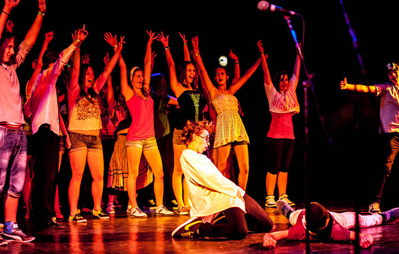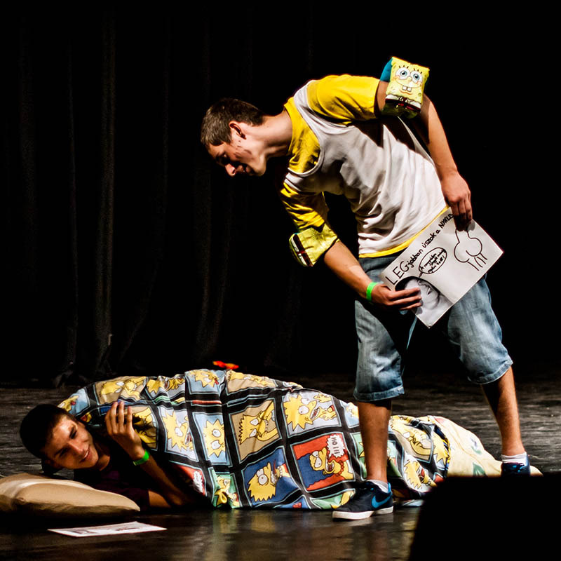 A szecskabál napján, már délután négykor megkezdődött a szecskáztatás Gyulán, a Kossuth téri „gödörben”, ahol egy komplett agility-pálya várta az „egyenpólós” elsősöket. Szlalomozás, mászás, ugrás, csőbenkúszás, ahogy kell a kutyusoknak is. Fél hat körül ért csak véget az ugr(ált)atásuk, ekkor felsorakozhattak a folytatásra. A cél: eljutni a művelődési házba, ami nem tűnik nagy teljesítménynek, kivéve, ha az emberrel menet közben tűz-víz-repülőt játszatnak! Így már kevésbé meglepő, ha egy fél órába került eljutni az uticélig, ahol a program a 9.-esek műsorával kezdődött. Mindegyik osztály (a, b, c, d) feladatként megkapta, hogy a tánckoreográfiát is tartalmazó előadásukban el kell hangozzanak bizonyos szavak, és minden osztály kapott egy-egy zenét is, amit szintén bele kellett építeniük műsorukba.