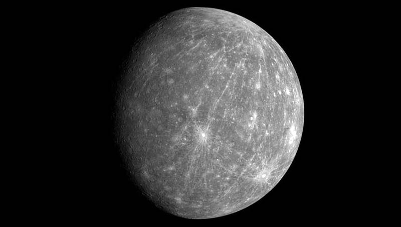 A Merkúr kráterekkel borított felszíne nagyon hasonló a Holdéhoz. A bolygó magja évmilliárdok alatt kihűlt és összezsugorodott, melynek következtében összeráncolódott a felszíni kérge. Felszínének legfőbb jellegzetessége az 1300 km átmérőjű Caloris-medence, amely a feltételezések szerint egy hatalmas, a korai Naprendszer idejéből származó ütközés során jött létre. Ez felelős a bolygó ellenkező oldalán elhelyezkedő különleges, egyenes barázdákkal borított terület kialakulásáért is, melyet az ütközés által keltett lökéshullámok hoztak létre. A kráterek mellett a Merkúr felszínén viszonylag sima síkságok is megtalálhatók, melyek két különböző korból származnak. Az egyik az ősi vulkáni aktivitás nyomán, a másik pedig az ütközések során kilövellt anyag ülepedése során keletkezhettek.