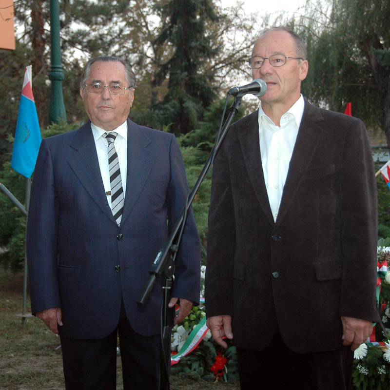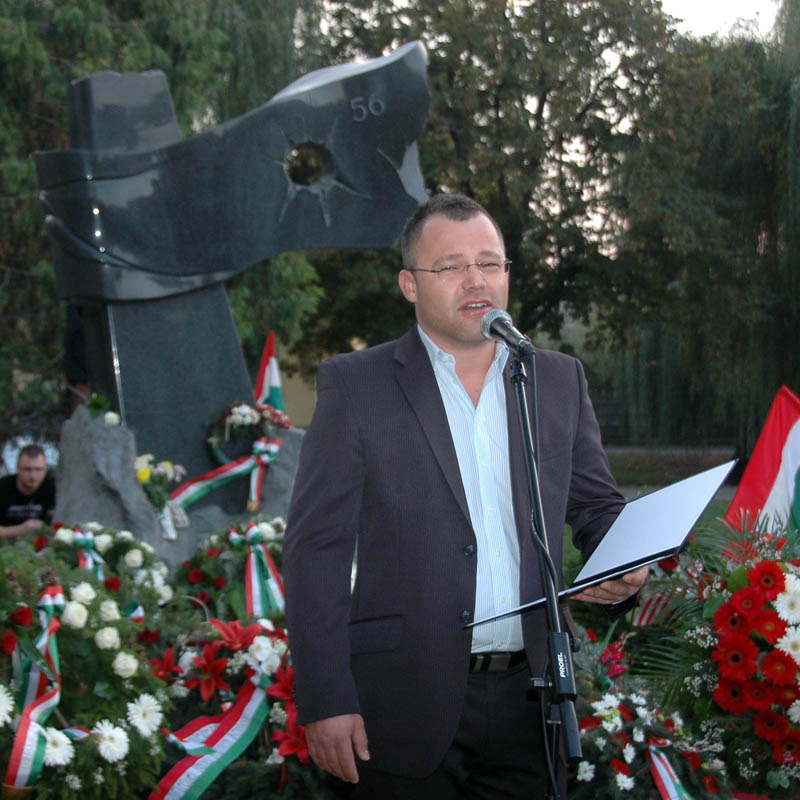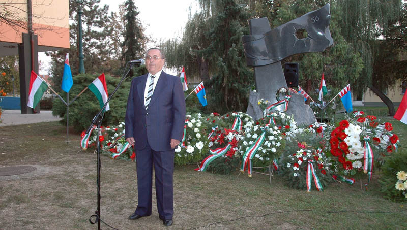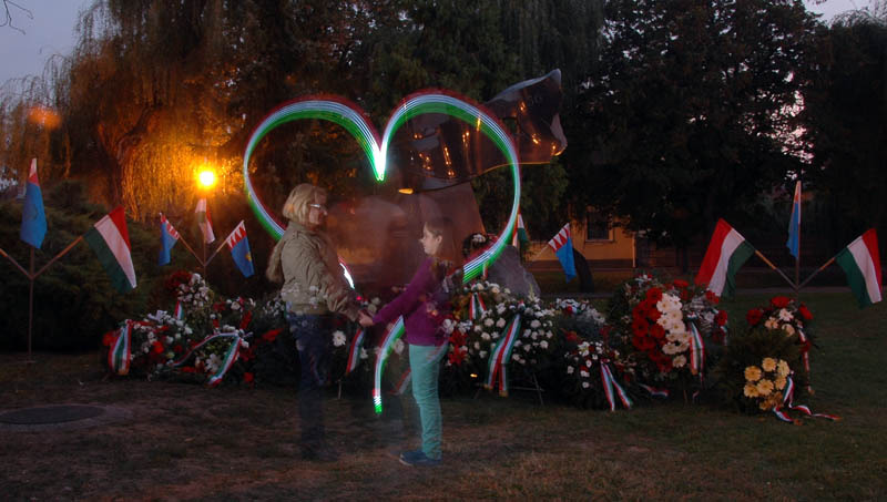 Különleges programmal, esti fényfestéssel emlékezett az ’56-os forradalomra és szabadságharcra az Október 23. Alapítvány Gyulán, az 1956-os emlékműnél. A mintegy nyolcvan főből álló közönséget M. Szabó András, Gyula város ’56-os polgármestere köszöntötte, majd Bálint Gergely szavalta el Márai Sándor Mennyből az angyal című versét.