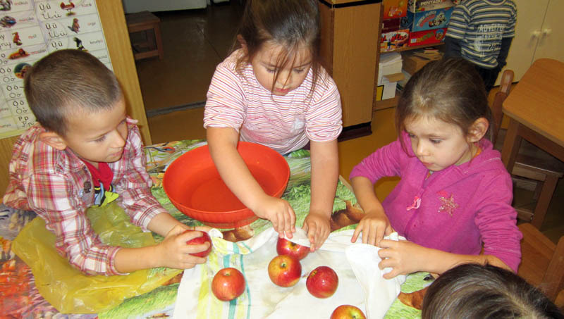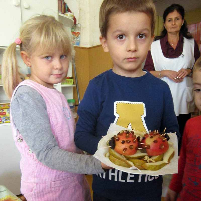 Óvodánk pályázat útján gyümölcscentrifugához és -aszalóhoz jutott. Bevontuk a gyerekeket a gyümölcsök mosásába, törölgetésébe, az almaszeletek elhelyezésébe az aszalóban, a gyümölcsdarabok centrifugába rakásába. Szívesen adagolták a mézet, a diót a gyümölcssalátába – a kóstolás során ízérzékük fejlesztése is célunk volt. Intézményünk csatlakozott a Minta-menza programhoz, amelyhez kiválóan kapcsolódott az alma felhasználásának sokoldalú bemutatása, ízlelése, az egészséges életmód szem előtt tartása mellett. Érdeklődve figyelték a gyermekek a keresztben és hosszában kettévágott almarészeket.