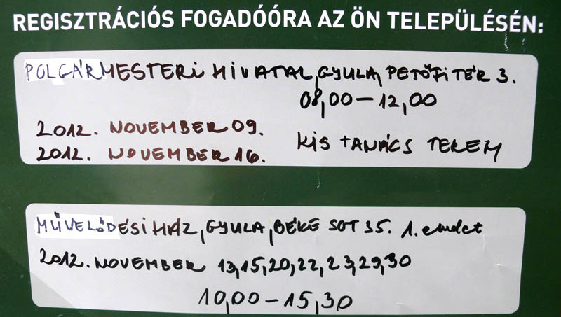 Gyulán az agrárkamarai tanácsadó irodákban Csányi Marianna várja az ügyfeleket, elérhetősége: 30/329-8139. A tanácsadó a polgármesteri hivatalban, november 9-én és 12-én 8 órától 12 óráig tart regisztrációs fogadóórát. A Gyulavári Szakigazgatási Kirendeltségben (Gyulavári, Illyés Gyula u. 4.) november 12-én 9 órától 13 óráig fogadja az ügyfeleket. A művelődési házban (Béke sugárút 35.) november 13-án, 15-én, 20-án, 22-én, 23-án, 29-én és 30-án 10 órától 15.30 óráig lehet regisztrálni.