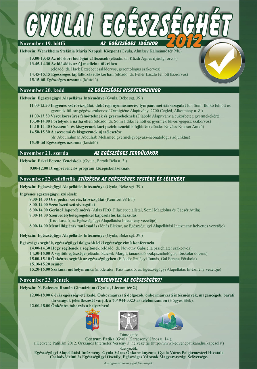 November 23-án, pénteken Versenyezz az egészségért! címmel 6 órás egészségvetélkedő zajlik a N. Balcescu Román Gimnáziumban (Gyula , Líceum tér 2.), ahol önkormányzati intézmények, magáncégek és baráti társaságok csapnak össze. Jelentkezni, illetve érdeklődni lehet a 70/ 944-3323-as telefonszámon.