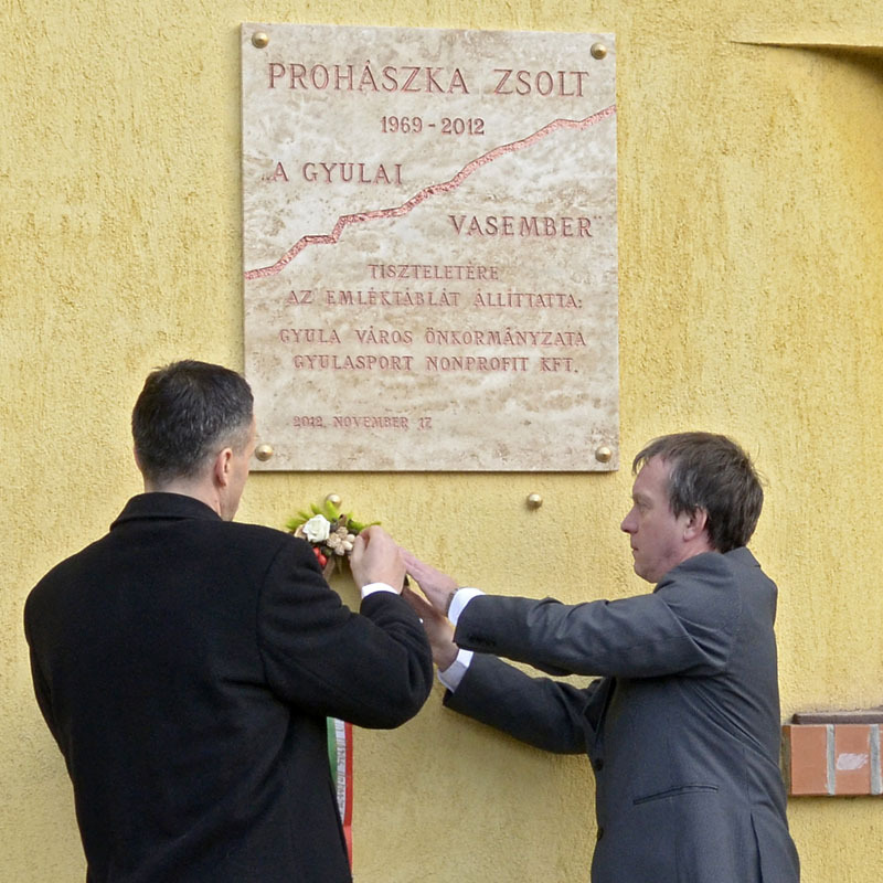 A gyulai vasember tiszteletére Gyula Város Önkormányzata és a Gyulasport Nonprofit Kft. egy kettétört életet jelképező emléktáblát állíttatott, amelyet dr. Görgényi Ernő és Torma Béla sportért felelős tanácsnok leplezett le. A koszorúzás és a virágok elhelyezése után a jelenlévők a tornacsarnok emeleti szintjén lévő emlékfal előtt is tiszteleghettek, majd kezdetét vette a kölyökkupa, amelyet ezután Prohászka Zsolt Emléktornának neveznek.