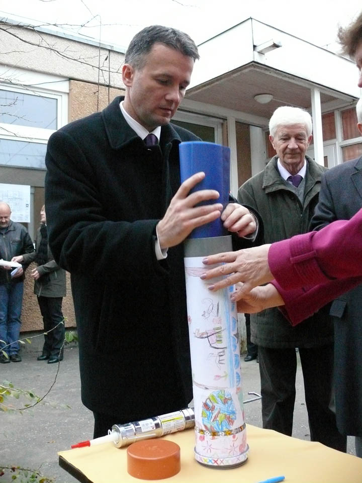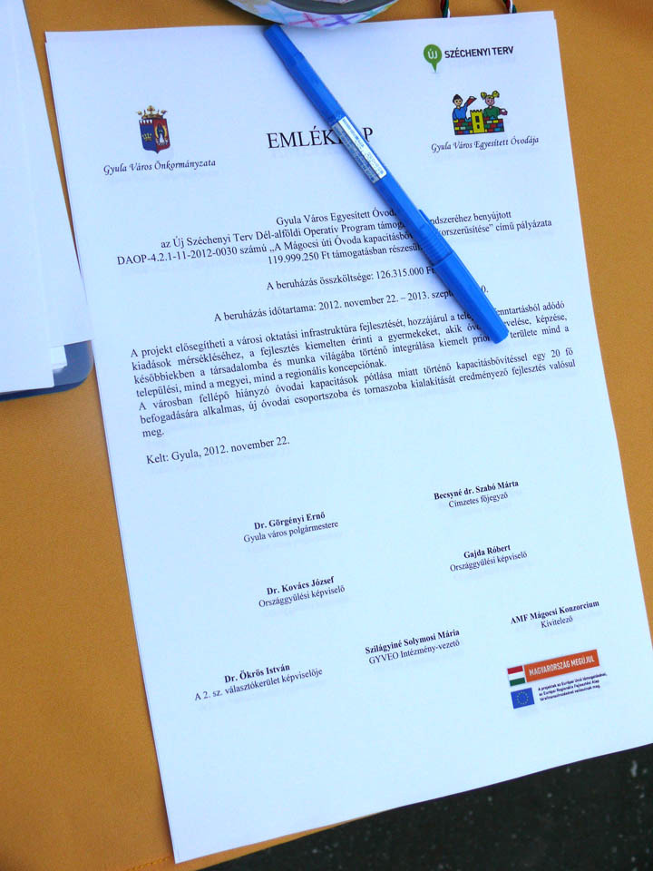Szilágyiné Solymosi Mária Gyula Város Egyesített Óvodájának igazgatója is köszönetet mondott a pályázatért és elmesélte, hogy az óvodások hogyan készültek a nagy eseményre, az alapkőletételre. Megrajzolták a kivitelezőknek, hogy milyen óvodát szeretnének, papírra vetették a kacsalábon forgó óvodájukat azért, hogy azokat majd egy időkapszulába helyezzék el és több száz év múlva, ha a kapszulát felbontják, a jövő óvodásai meglássák a mostani gyerekek óvodaálmait.