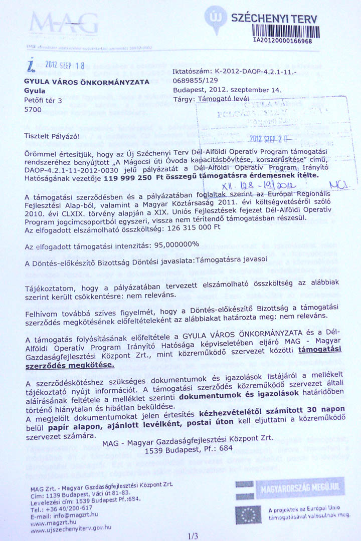 Dr. Görgényi Ernő polgármester arra hívta fel a figyelmet, hogy bár sok beruházás van és lesz a városban, mégis ez egy olyan beruházás, amit semmilyen szempontból nem lehet jogos kritikával illetni. Akárhonnan nézzük, mindenhol a pozitívumokat lehet látni. Ez a projekt befektetés a jövőbe, olyan vertikumot fejlesztünk, amely a gyermekek jövőjéről szól. Rendkívül fontos az óvodások indítása egy ember életében. A humán tőke mellett legalább ennyire fontosak az infrastrukturális feltételek. Az előkészítő munka, Megyeri Sándornak a mérnöki és környezetvédelmi osztály vezetőjének irányításával szakszerűen zajlott le, sőt bevonták a munkálatokba az óvodapedagógusokat. Ezt azért látták indokoltnak, hogy ne csak műszaki szempontból, de nevelési szempontból is olyan létesítmény épüljön, ami a legjobban szolgálja a gyulai gyermekek érdekeit. Az előkészítés pedig olyan jól sikerült, hogy a pályázati dokumentációt időben sikerült beadni. A polgármester köszönetet mondott Molnár Csabának, aki a pályázat megírásáért volt felelős, végezetül kiemelte, hogy a kivitelezésben kizárólag gyulai vállalkozók vesznek részt.