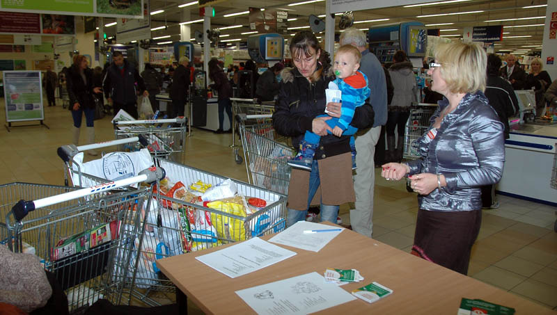 - Eddig körülbelül 50 kg tartósélelmiszert gyűjtöttünk, a vásárlók főleg lisztet, cukrot, tésztát, étolajat, rizst, tartós tejet, mogyorót, szaloncukrot adományoznak. Szívesen veszik az adománygyűjtő akcióról szóló szórólapjainkat és szívesen is adnak a rászorulóknak. Cserébe néhány, könnyen elkészíthető, karácsonyi mézes sütemény receptjével kedveskedünk azoknak, akik segítségével sikerül a hátrányos helyzetű családok karácsonyát teljesebbé tenni – mondta a helyszínen Szendreiné Dudás Ildikó, a gyulai egyesület elnöke.