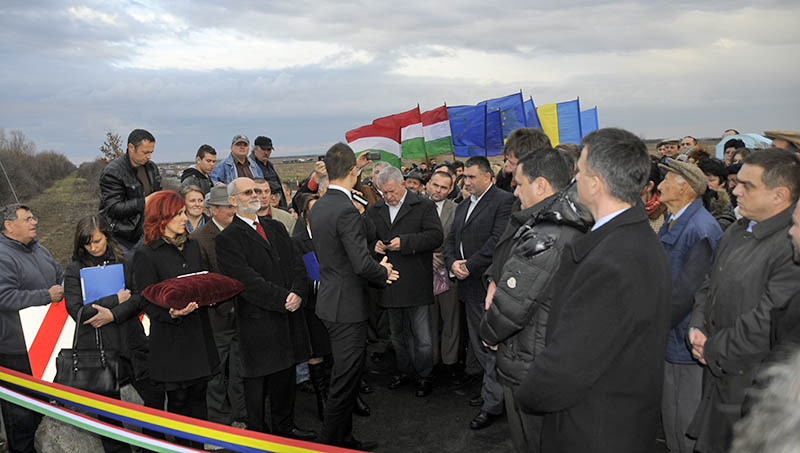 – Egy út átadása mindig ünnep, hiszen javítja a közlekedési lehetőséget, összeköt embereket egymással. A mai útátadás még ennél is erősebb szimbólumokkal rendelkezik. Annak idején, az I. világháborút megelőzően a Kárpát-medencében egységes gazdasági térség működött, városunk gazdasági vonzáskörzetéhez 30 település tartozott. Gyula élénk gazdasági, kulturális és gazdasági kapcsolatokat ápolt. A trianoni békeszerződéssel azonban ezek a kapcsolatok megszakadtak, de az igény rá ennyi évtized elteltével is megmaradt, hiszen a Körösköz gazdaságilag összetartozik. Azonban ahhoz, hogy kapcsolatainkat ápoljuk, jelentős kerülővel tudunk eljutni a gyulai határátkelőn át a Körösköz térségébe. Az út az egykori kisvasút nyomvonalán épült. A vonatsíneket már régen felszedték, azonban most a vasút helyett közutat építettünk, gyulai oldalon 1 kilométert, a Romániához tartozó szakaszon 7, 6 km-es szakasz valósult meg. Az út üzenete, ha felszedik a bennünket összekötő vasútvonalat, akkor helyébe előbb vagy utóbb utat építünk – hangzott el dr. Görgényi Ernő polgármester tájékoztatójában.