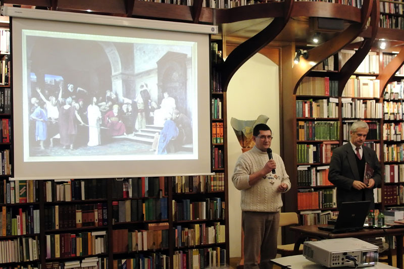 Dr. Reisinger János sorra vette a kép jellegzetes alakjait, az arckifejezéseiket, amelyek indulatokat, jellemeket fejeznek ki - ahogyan egy romantikus-realista festő látja. Pilátust szinte satuba fogják a vallási vezetők, hogy ne is dönthessen másként, minthogy halálba küldje Jézust. Pilátus arcán érzelemviharok jelzik, átlát a körülállókon és Jézussal folytatott párbeszéde során rájön, hogy az előtte álló, összevert fiatal férfi ártatlan. Pilátus kéztartásán is látszik, hogy gondolataival küszködik. A háttérben álló tömeg sem alaktalan, a festő mindegyik szereplőnek láttatja a jellemét. Van köztük jámbor, szemlélődő és felheccelt, aki megfeszítést követel. A megfeszítést a perzsáktól vették át a rómaiak, 2-3 napon át tartó kínhalált, fulladást jelentett. Ennél kegyetlenebb kivégzést ember még nem talált ki - mondta az előadó.