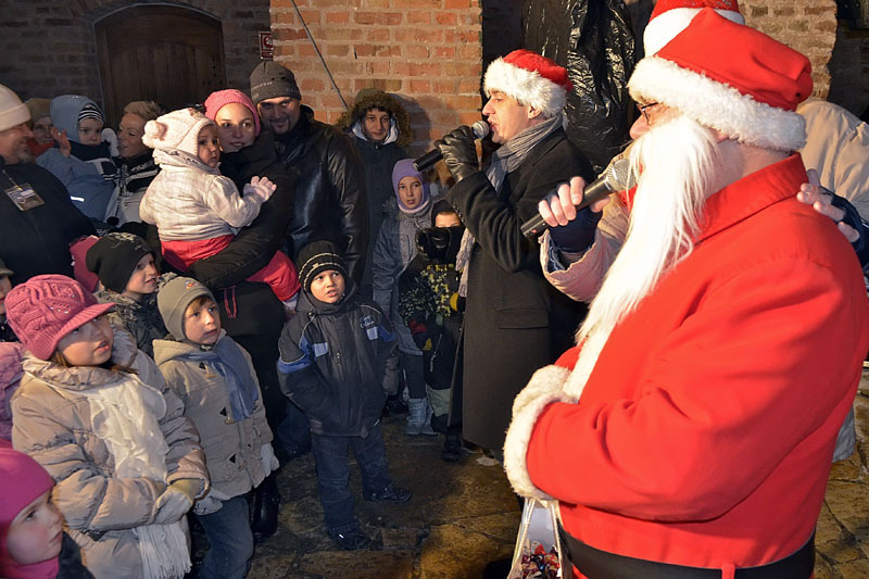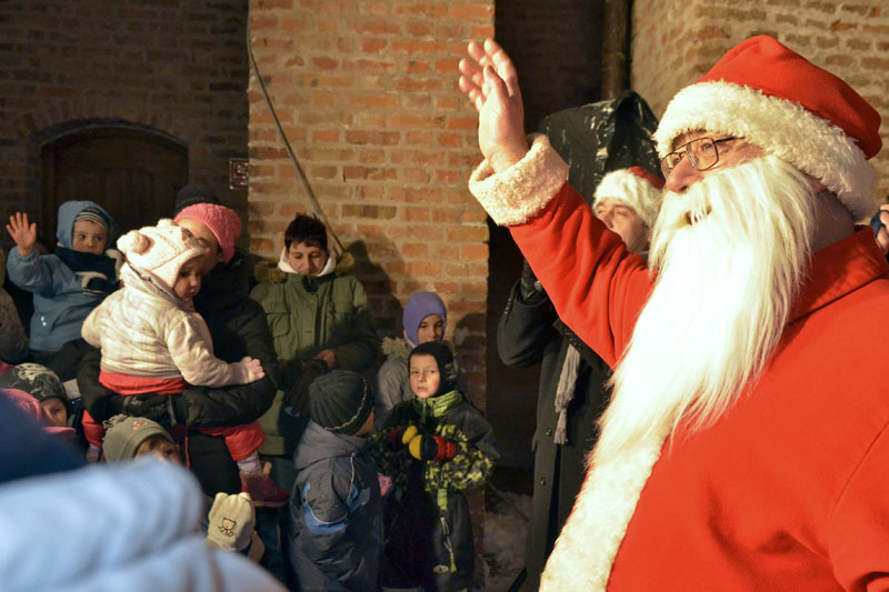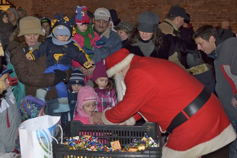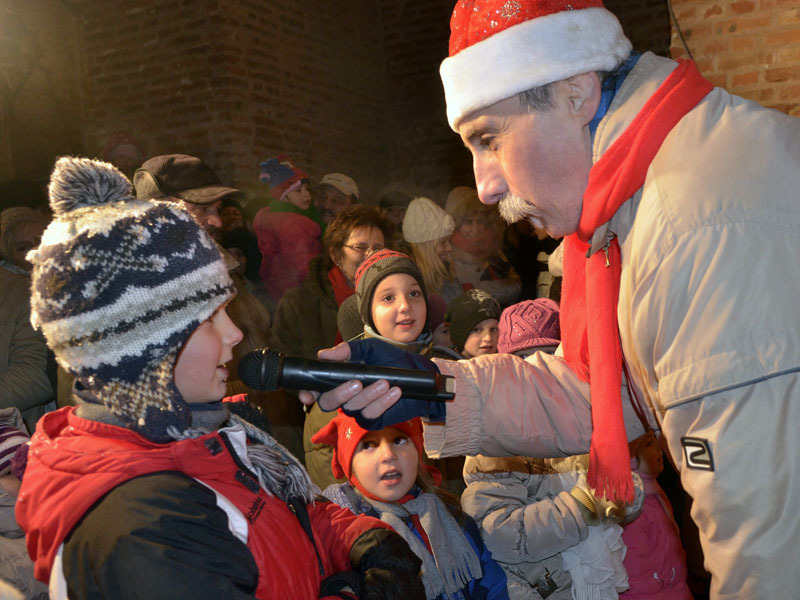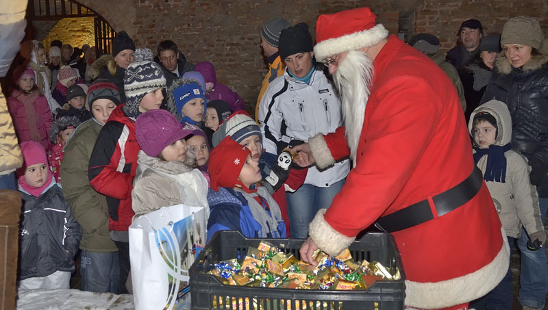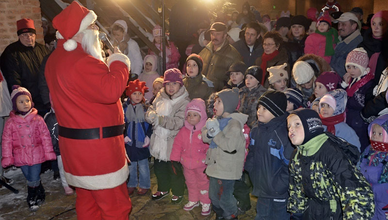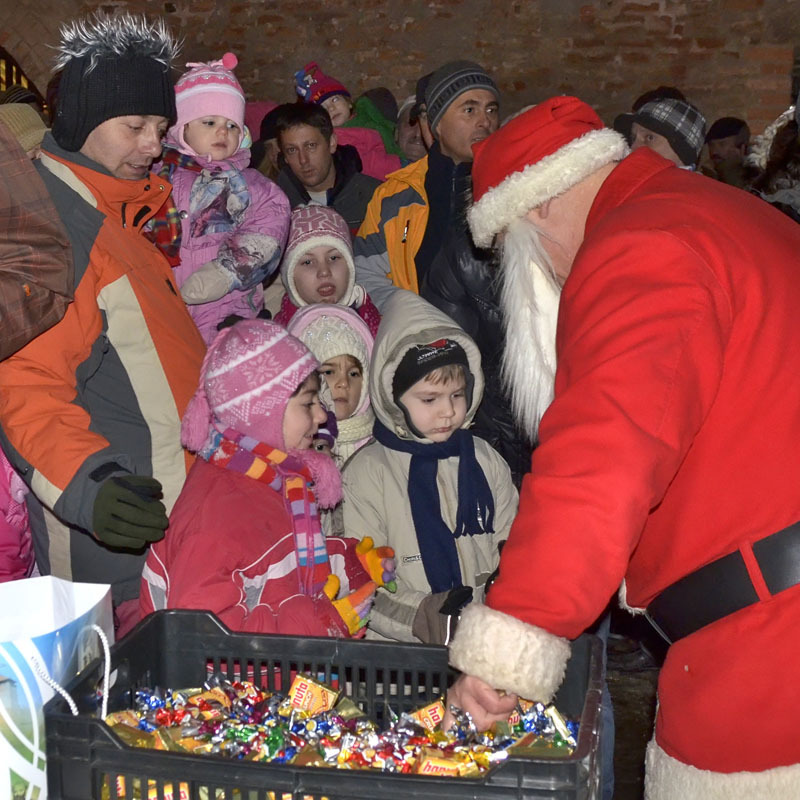 A hófehér tájban már messziről világítottak a gyulai vár előtt felállított karácsonyfa fényei, a várudvar pedig a Hull a pelyhes fehér hó kezdetű daltól volt hangos. A kicsik vidáman énekeltek együtt a Mikulással, aki hálából felelevenítette nekik Szent Miklós püspök történetét, majd meggyújtotta a város adventi koszorúján a második gyertyát. Az ünnepség végén a Télapó édességgel ajándékozta meg a vár előtt várakozó csöppségeket.