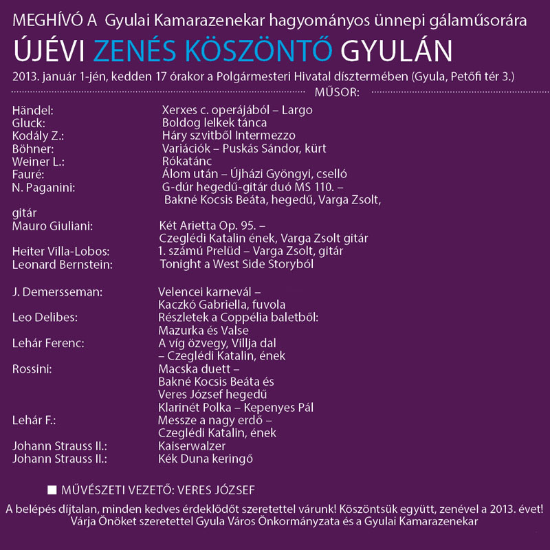 Újév napja alkalmából a Gyulai Kamarazenekar hagyományos ünnepi gálaműsort ad január elsején, kedden 17 órakor a polgármesteri hivatal dísztermében.