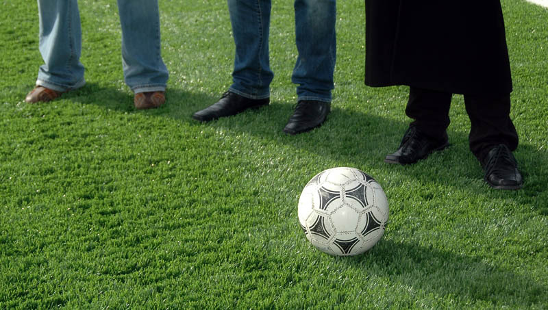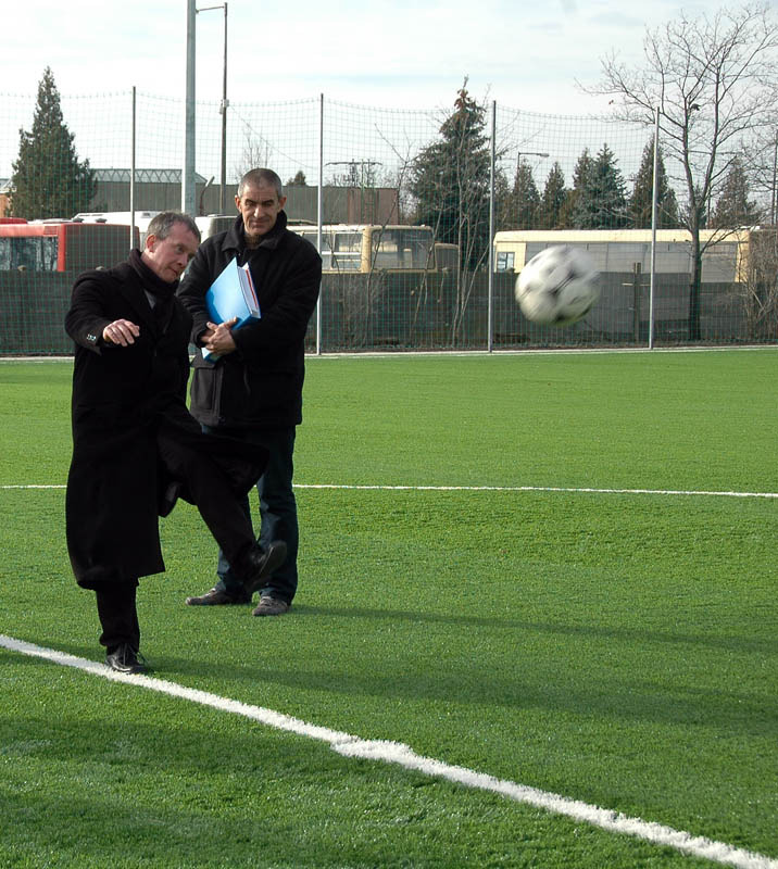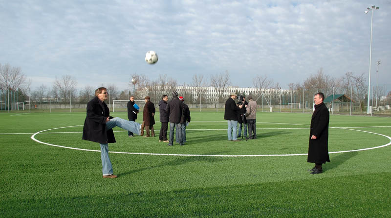 A műszaki átadást követő sajtótájékoztató után a városvezetők nem kímélték a bőrlabdát, és ki is próbálták az új sportlétesítményt.