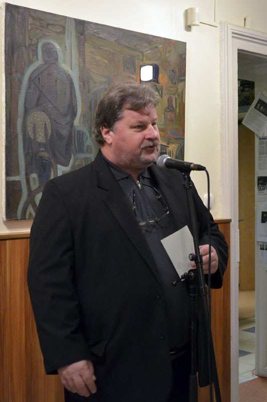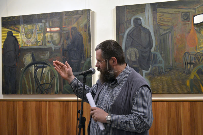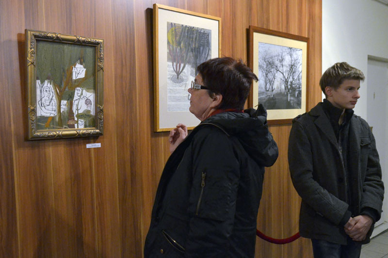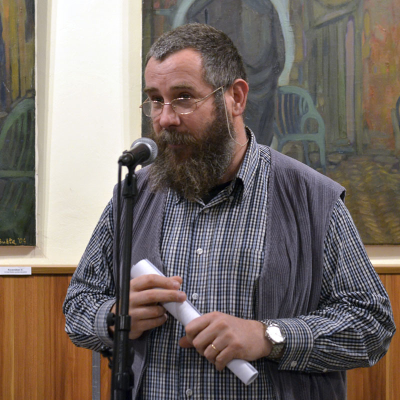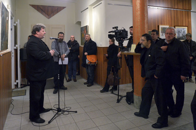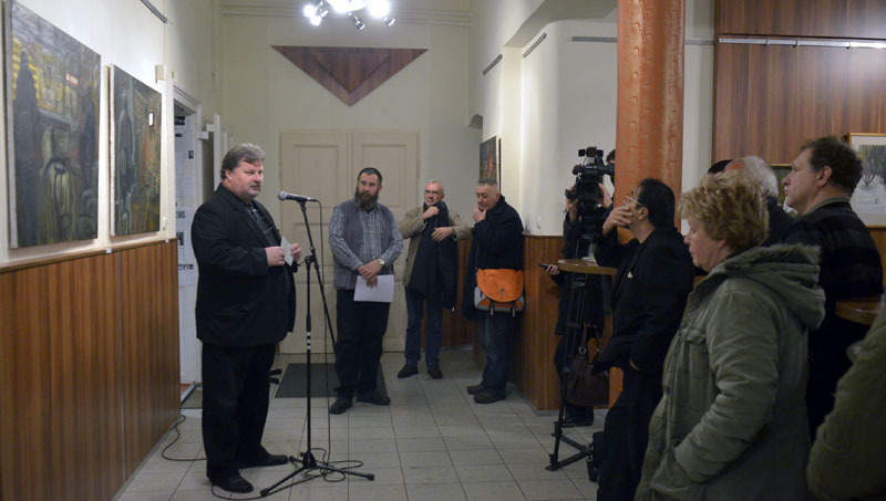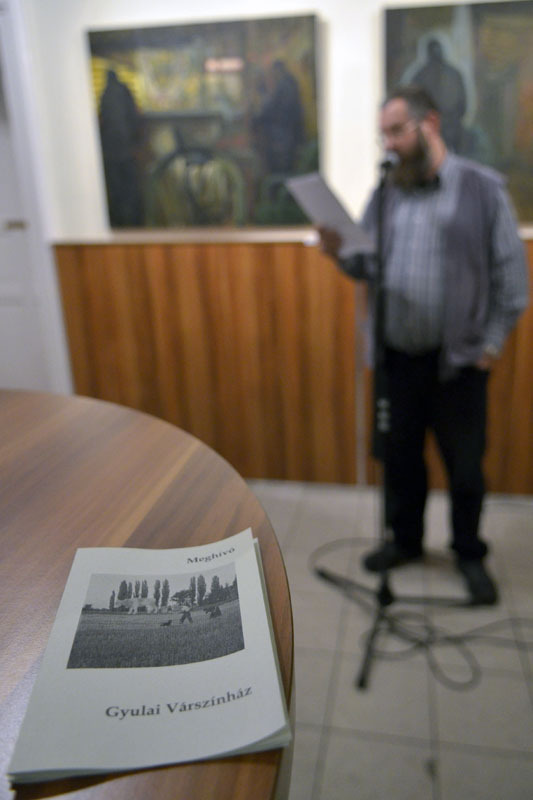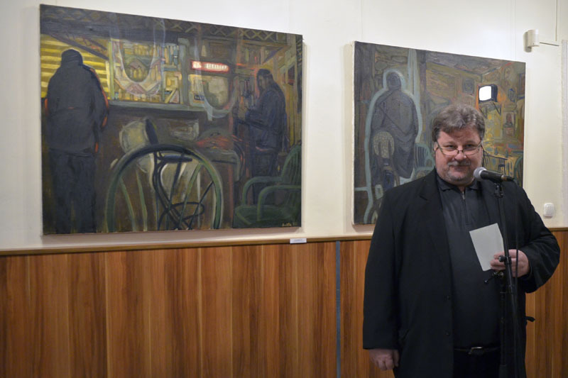 – Sufni, buhera, gány. Ez a három szó mindenki számára ismert, és némi iróniával mondhatjuk, hogy a falusi vizuális jelenvalóság meghatározói. Az elhanyagolt házak omló vakolatának mintázata, a megbontott tető lécezetének geometriája, a kerítések ritmikája vagy a tájban megtalálható ismétlődések mind-mind megtalálhatók a festményeken. Ezek a képek hordozzák a múltat, mutatják a jelent és magukban hordozzák az örökkévalóságot. A neodadaizmushoz közeli, minden művészi szabályszerűséget felforgató és megkérdőjelező elemekből és az akár ezekkel ellentétes rituális mozdulatokkal létrehozott felületekből született művek egy organikus világszemléletről tanúskodnak. A lokalitás megragadásán keresztül a globális struktúrák is értelmezhetővé válnak – hangzott el a beszédben.