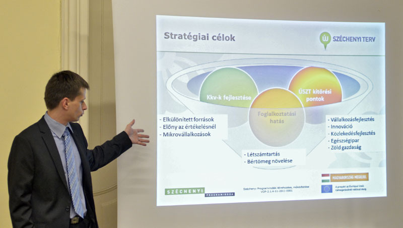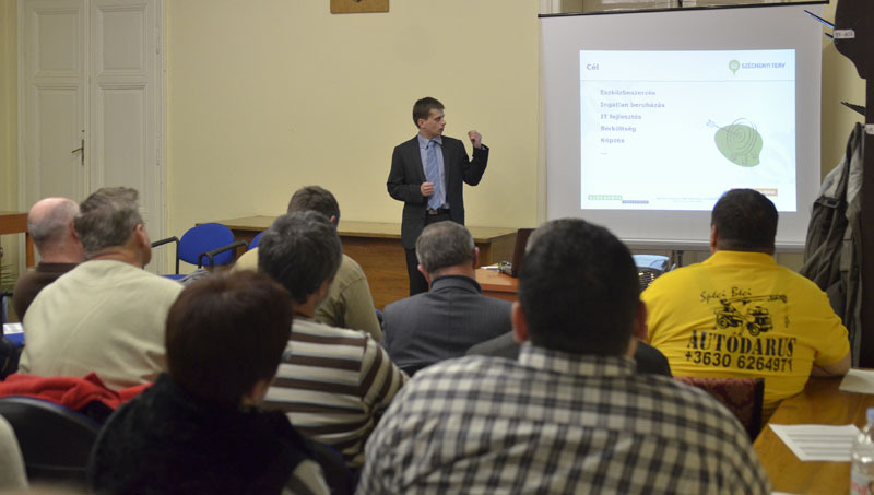 A Pályázatok házhoz jönnek! című előadáson elsőként Marton András, a gyulai Széchenyi Programiroda tanácsadója beszélt a pályáztatás folyamatáról. Olyan kérdéseket is megválaszolt például, hogy mi a köze az előző évi árbevételnek a tervezett projekt volumenéhez, vajon miért kell plusz embert foglalkoztatni, miért kell megtartani a munkahelyi létszámot és mi az oka annak, hogy a személyügyi ráfordítások növelése is feltétel. A tanácsadó kitért arra, hogy mely pályázatok uniósak, és melyek azok, amelyek a magyar kormány épp aktuális gazdaságpolitikájából erednek.
