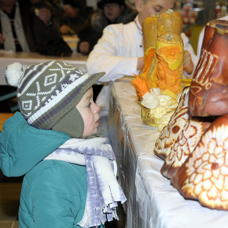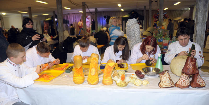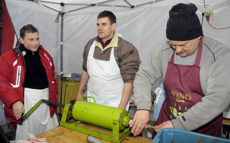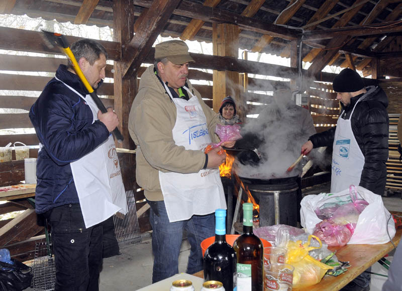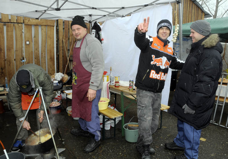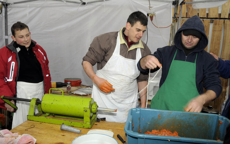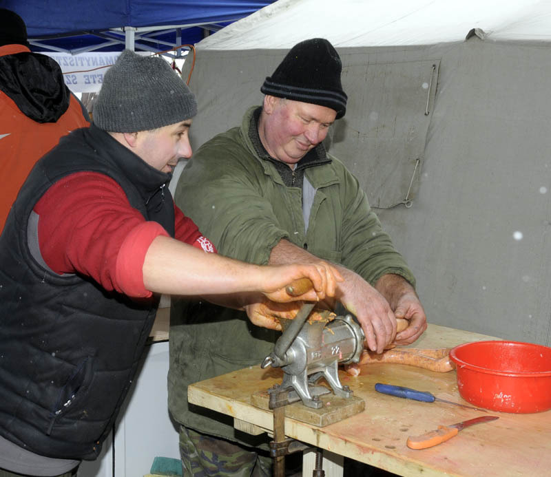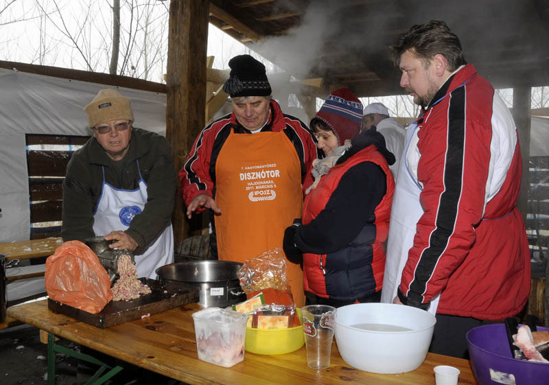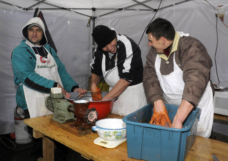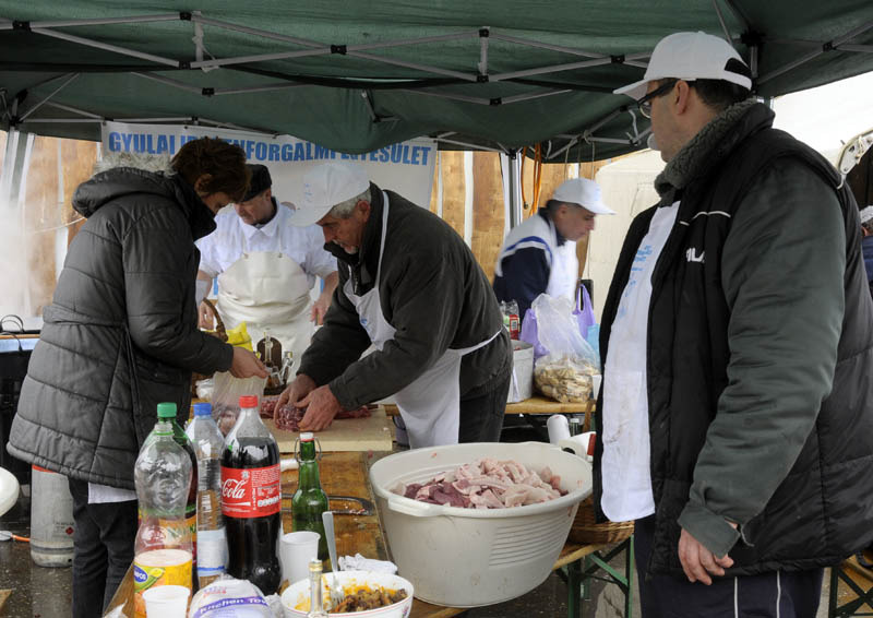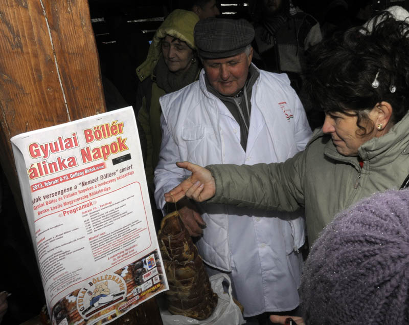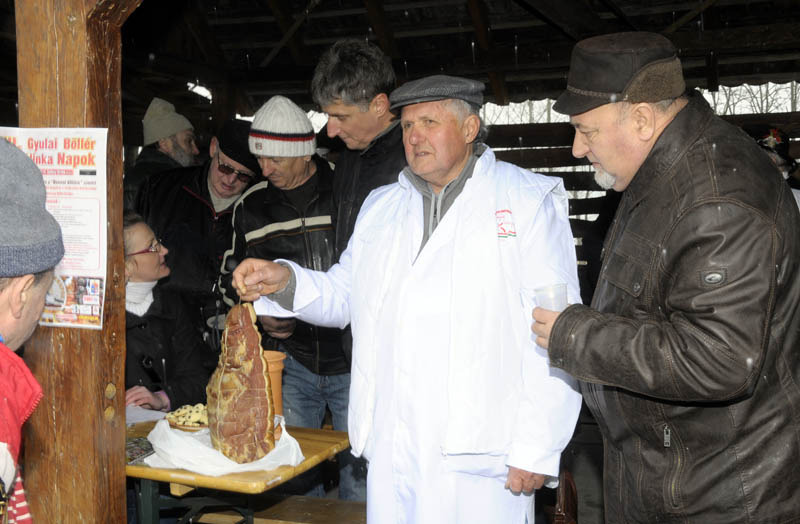 Hóesésben, igazi disznótoros idősjárásban kezdődött ma kora reggel a 13. Böllérverseny és I. Gyulai Pálinkanapok a Gellény Birtok és Kalandparkban. Bár a hagyományápoló rendezvény ezúttal a városon kívül zajlik, a rengeteg parkoló autó és a tele vagonokkal forduló kisvonat nagy létszámú vendéget sejtet. A kapun beérve népművészeti termékeket áruló standok kísérik az ember útját a böllérversenyig, amelyen hat csapat méri össze disznóságkészítő tudományát. A vetélkedő reggel óta tart, nincs senki elkésve. Valahol még a csak a húst csontozzák, a másik helyen már kezdik tölteni a kolbászt. Hamarosan készül a hurka, a kolbász, toros káposzta, tepertő és még mennyi jó falat. Mindeközben folyik a pálinka, szól a muzsika, és kellemes illatok szállnak a hóesésben, hogy aztán orrba jutva kóstolásra késztessék vendégsereget. Fedett helyen szórakoztató műsorok gondoskodnak a jó hangulatról, miközben a gyerekek kézműveskedhetnek, vagy álmélkodhatnak, milyen szép dolgokat lehet faragni zöldségekből vagy éppen sódarból. Akinek még ennyi sem elég, tippelheti a sonka súlyát, s ha ügyesen határozta meg, haza is viheti a füstölt finomságot.