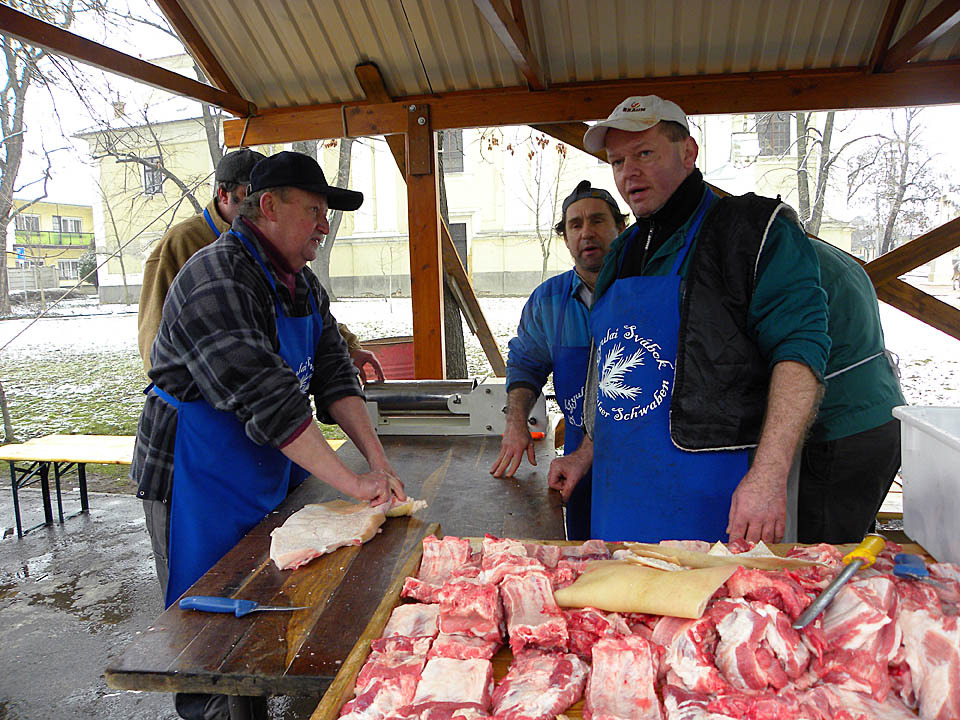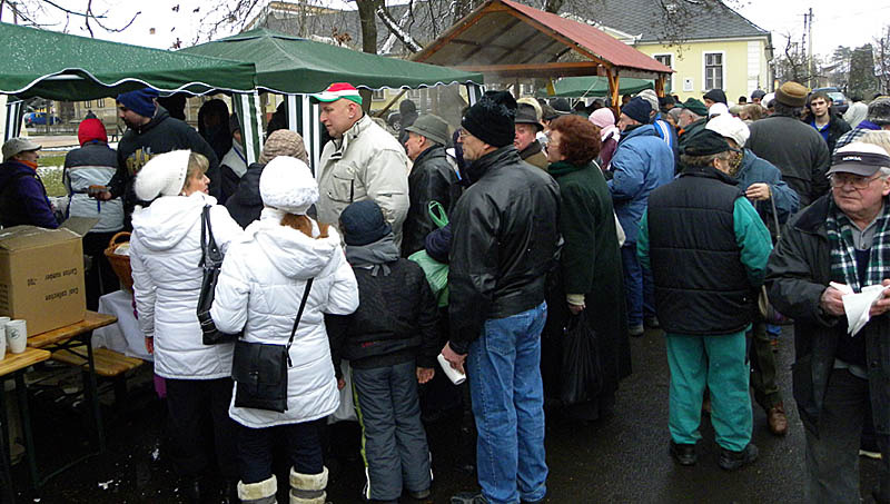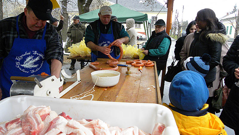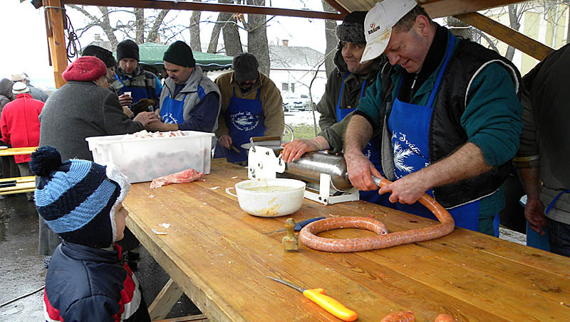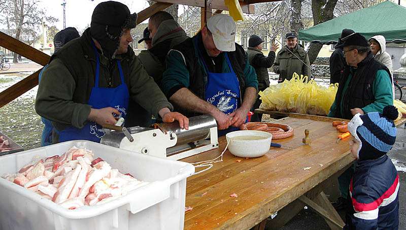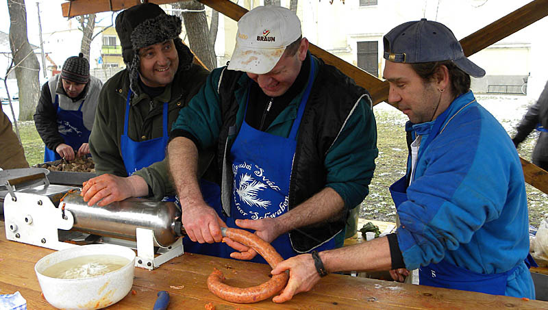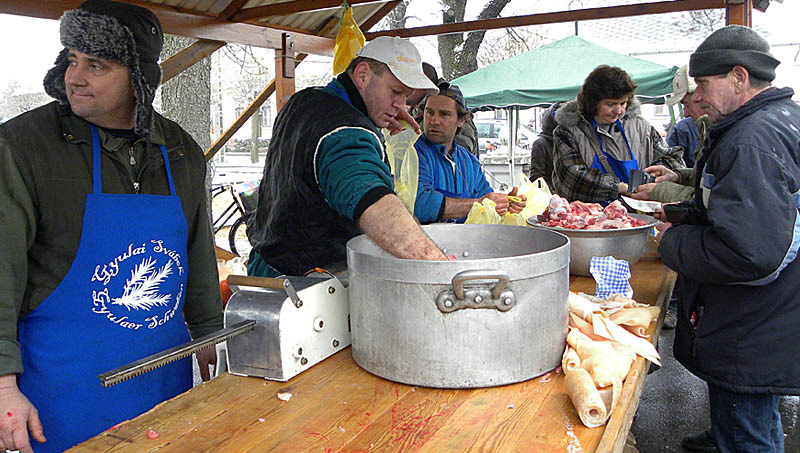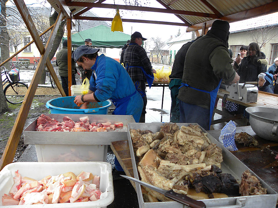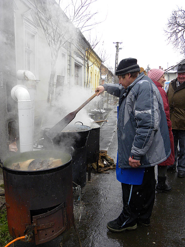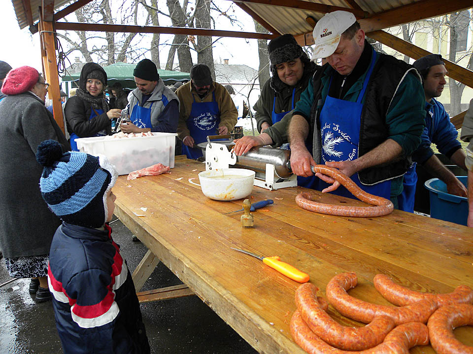 A hat böllér reggel háromnegyed hatkor látott hozzá a két 180 kilós disznó kopasztásához és feldolgozásához. Közben a vendégsereget pogácsával és pálinkával kínálták az Apor téren, ahol a maszkásoknak köszönhetően idén is felidézték a régi farsangi szokásokat. A programon a gyerekek sem unatkoztak, hiszen a Szűz Mária Kegytárgy Múzeumban délelőtt 11 órától kalácstésztából készíthettek disznófejet, a bátrabbak pedig Dani szamár hátán is tehettek egy kört a Szent József-templom előtt.