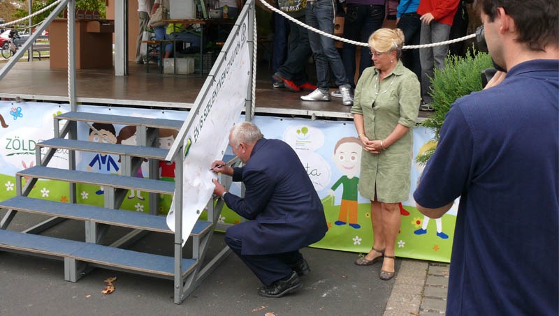 Gyerekeket és pedagógusokat is vár a zöldtárca uniós pénzből megvalósuló Zöld Kréta roadshow-ja, mely az ÖKO-Pannon hagyományos Újrahasznosítási Hónapjának rendezvénykamionjához csatlakozva járja az országot. A rendezvény megnyitása után dr. Perjési Klára polgármester és Kneifel Ferenc, a Gyulai Közüzemi Kft. ügyvezető igazgatója az első vendégekkel együtt próbálták ki a helyszín interaktív játékait: egyebek mellett az élő társasjátékot, a hulladékvadászatot, a mágneses szeparátort és a mini hulladékválogatót. Az Újrahasznosítási Hónap kiállítóeszközeit a Csodák Palotája tervezői készítették, minden kipróbálható, megérinthető volt.