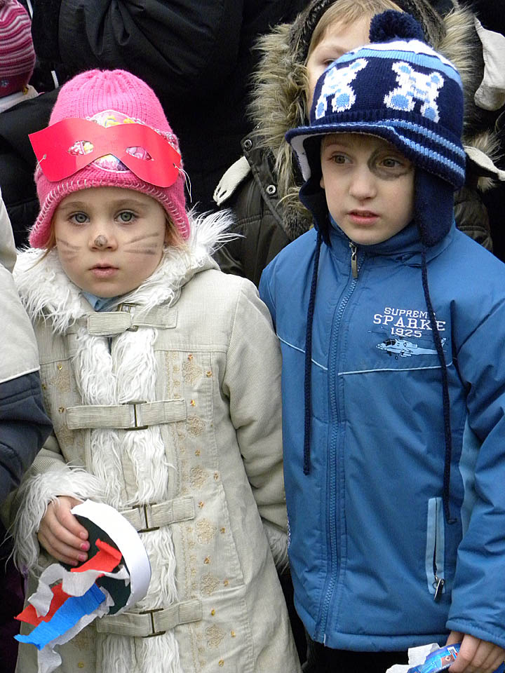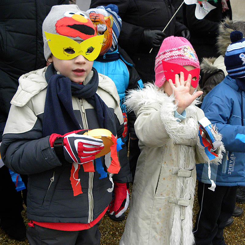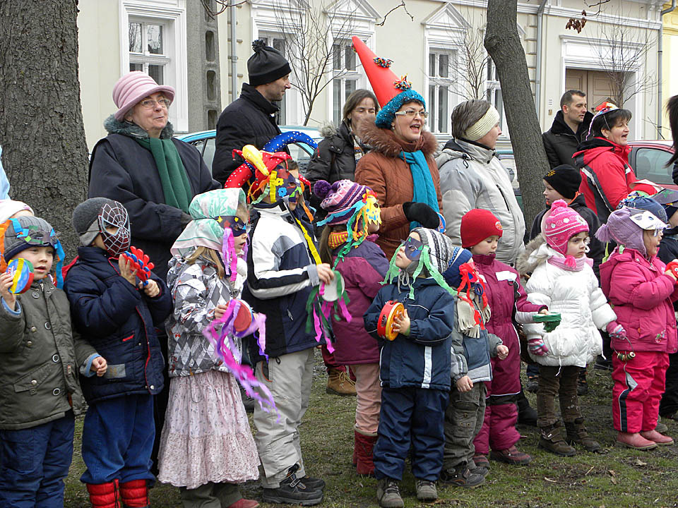Kereplőkkel, csörgőkkel, dudákkal, fedőkkel és fakanalakkal érkeztek az Apor térre a németvárosi óvodások és az Implom József Általános Iskola német nemzetiségi tagozatos tanulói, hogy elkergessék a telet. A gyerekek a Szent József-templom melletti füves területen sorakoztak fel, hogy megnézzék, hogyan ég el a telet jelképező kiszebábu. A tél elűzésében idén is egy álarcos maszkás segített a kicsiknek.