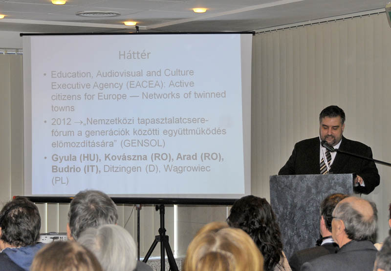 Az értekezés szakmai része előtt Bognár Levente, Arad város alpolgármestere mondta el megnyitó beszédét. Az aradi városvezető hangsúlyozta, Gyula és Arad között majdnem két évtizede jól működő testvárosi kapcsolat van, s a most folyó idősügyi konferencia is egy olyan közös program, amely tovább erősíti a testvérvárosokat érintő kapcsolatokat, és lehetőséget ad a további közös munkára. Témája kifejezetten aktuális mindkét városban, hiszen egy társadalom fejlettségének mutatója, hogy hogyan törődik a gyermekekkel és az idősekkel.